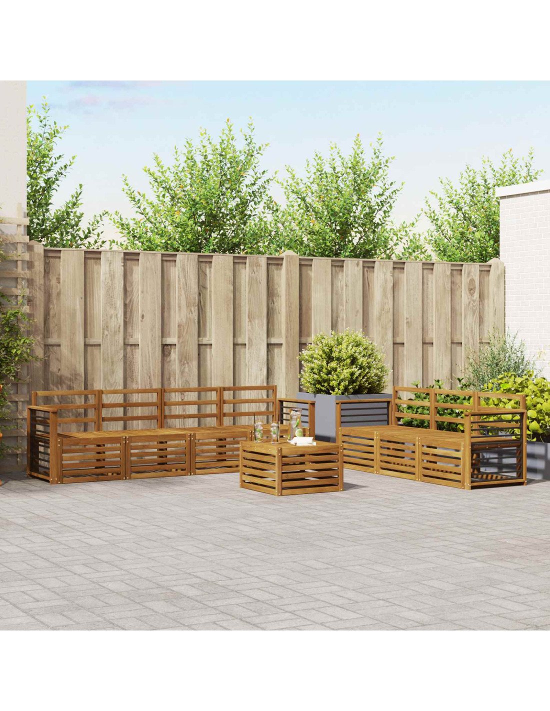 Il set di mobili per esterni unisce stile e funzionalità, creando un punto centrale accattivante per ogni giardino o terrazzo. Con un design moderno dalle linee pulite e dettagli essenziali, aggiunge un tocco di eleganza e incoraggia il relax nelle serate con amici e nei momenti di socialità. Realizzato in legno massello di acacia, è durevole e mantiene il suo fascino nel tempo, rendendolo la scelta perfetta per chi cerca praticità e design raffinato per i mobili da esterno.