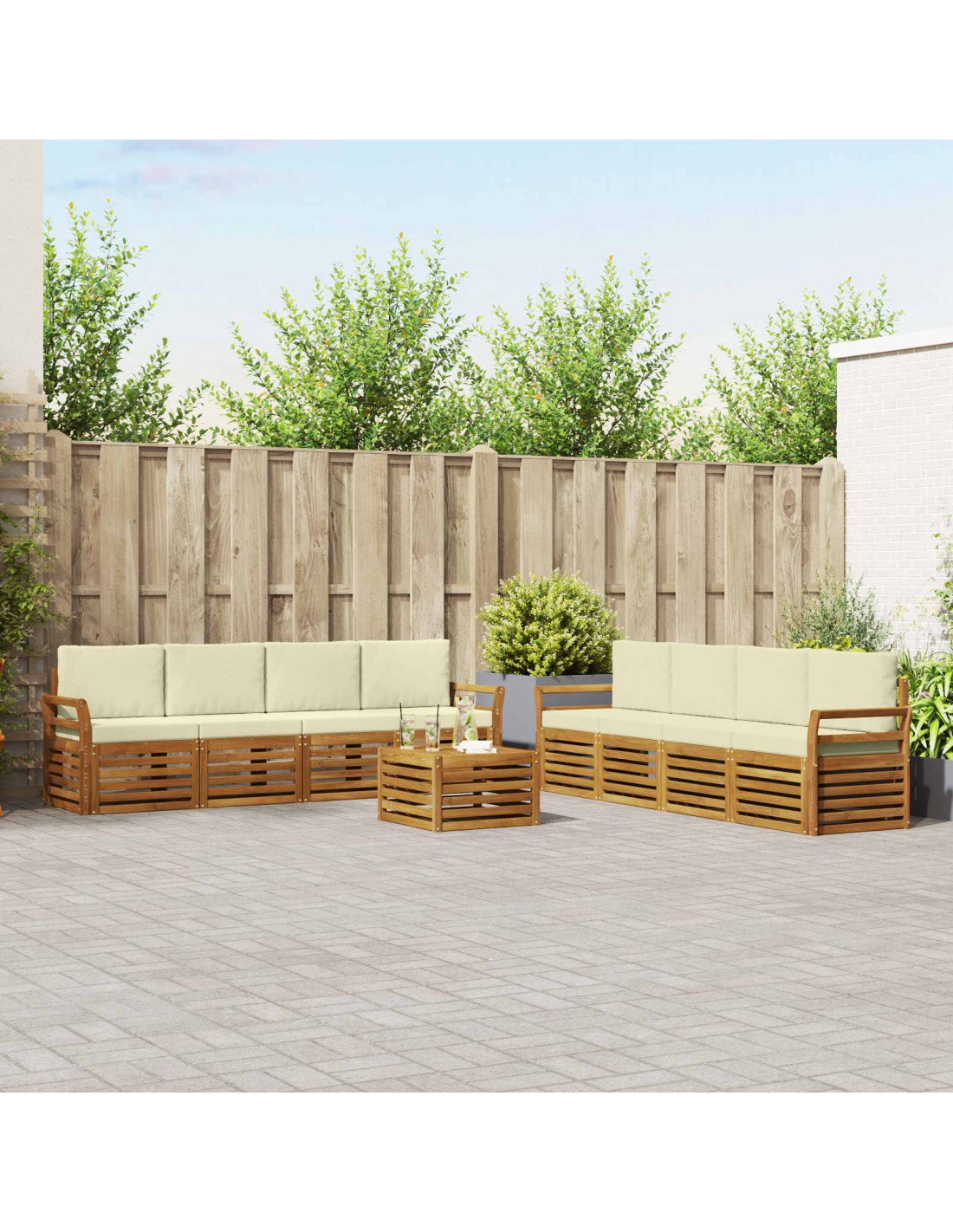 Il set di mobili da esterno unisce stile e funzionalità, creando un pezzo centrale straordinario per ogni giardino o terrazzo. Il design moderno, con linee pulite e dettagli minimali, aggiunge eleganza e favorisce i momenti di relax e socialità all'aperto. Realizzato in legno massello di acacia, è resistente e mantiene un appeal visivo duraturo, ideale per chi cerca praticità e design nei mobili da esterno.
