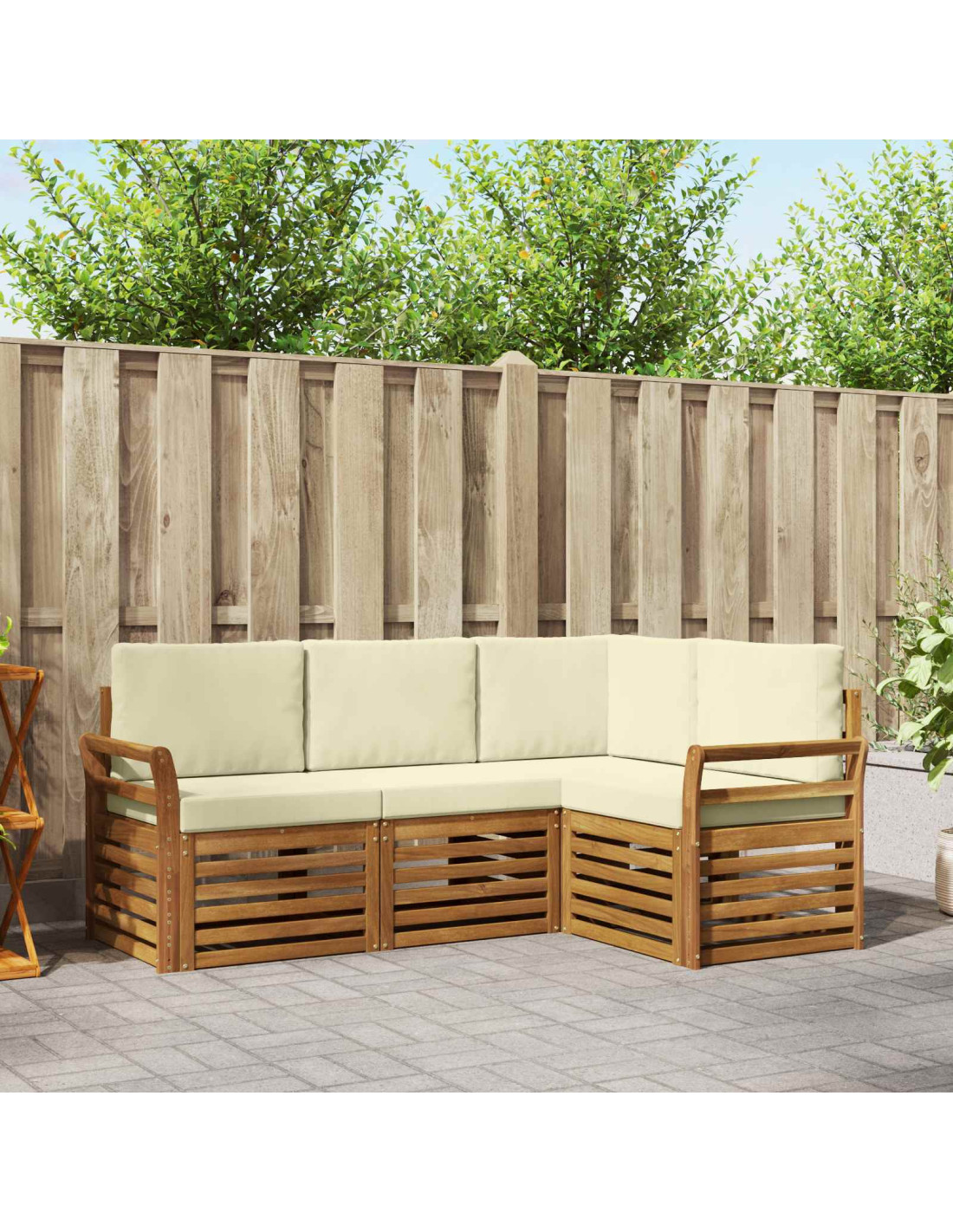 Il set di mobili da esterno combina stile e funzionalità, creando un punto focale unico per giardini o terrazzi. Il design moderno, con linee pulite e dettagli minimi, aggiunge un tocco di eleganza mentre favorisce il relax e le riunioni all'aperto. Realizzato in legno massello di acacia, è resistente e visivamente piacevole, perfetto per chi cerca praticità e design raffinato nei mobili da esterno.