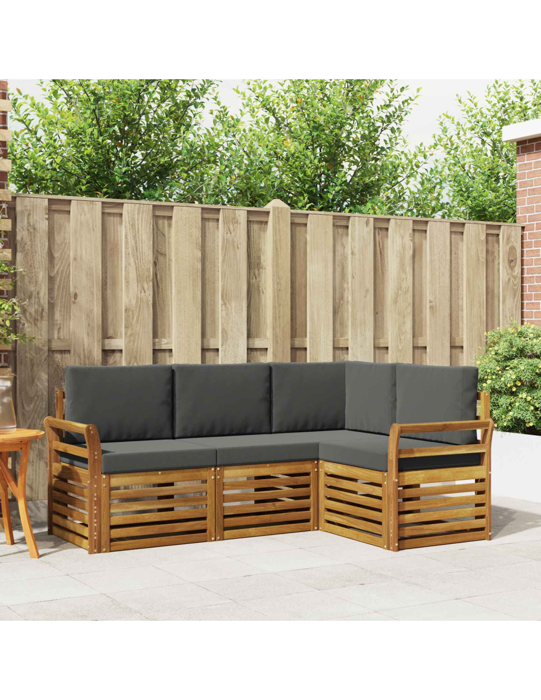 Il set di mobili da esterno combina stile e funzionalità, creando un punto focale unico per giardini o terrazzi. Il design moderno, con linee pulite e dettagli minimi, aggiunge un tocco di eleganza mentre favorisce il relax e le riunioni all'aperto. Realizzato in legno massello di acacia, è resistente e visivamente piacevole, perfetto per chi cerca praticità e design raffinato nei mobili da esterno.