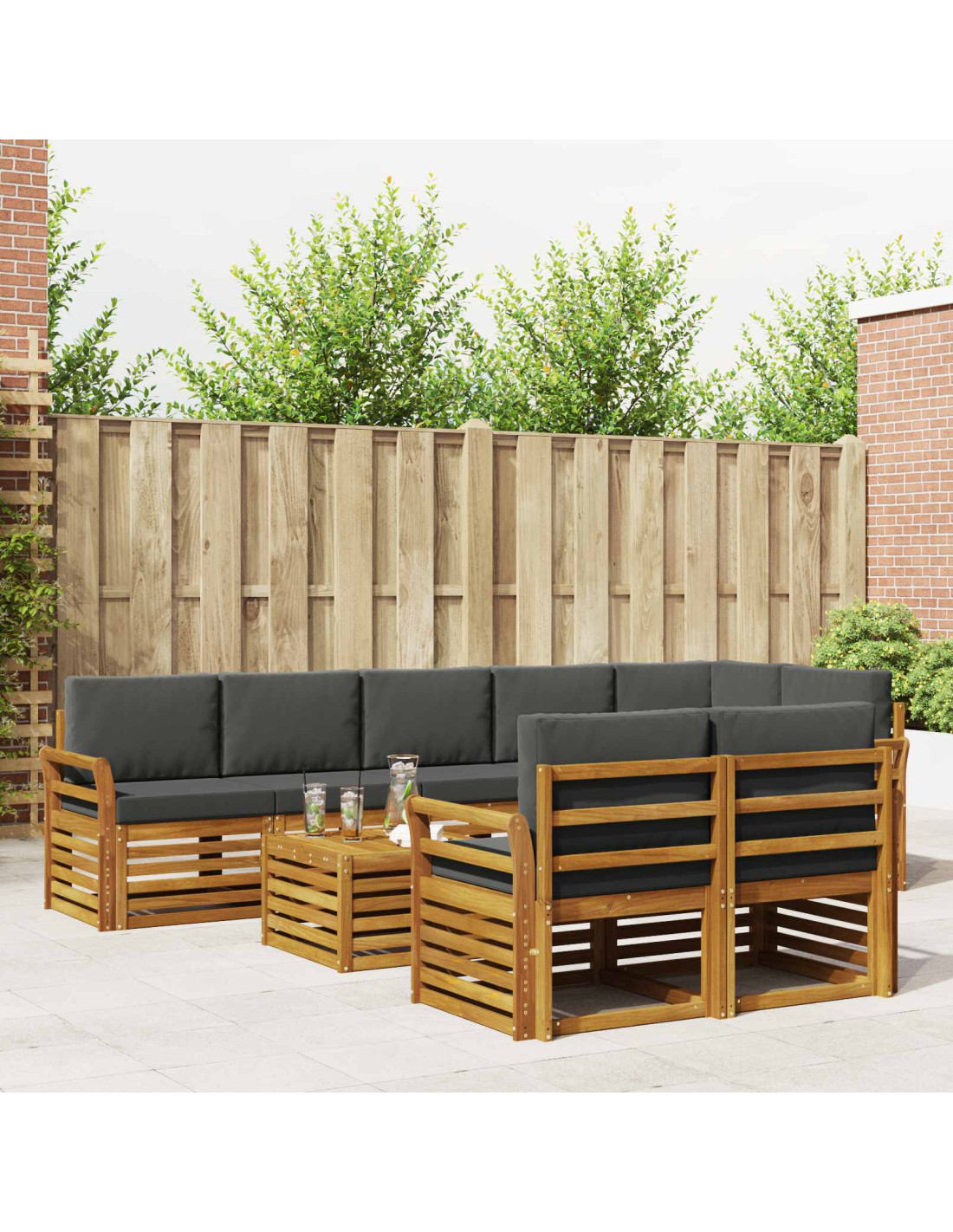 Questo set di divani sezionali per esterni incarna uno stile contemporaneo. Realizzato in legno massello di acacia marrone, porta calore e eleganza ovunque lo usi. Puoi riconfigurare i suoi pezzi per adattarli al tuo spazio, offrendo flessibilità e una disposizione personalizzata dei posti a sedere.