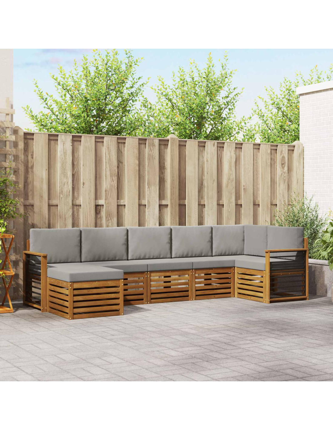 Il set di mobili per esterni unisce stile e funzionalità, creando un punto focale splendido per giardini e terrazze. Il design moderno, con linee pulite e pochi fronzoli, aggiunge un tocco di eleganza, perfetto per relax all’aperto e momenti sociali. Interamente in legno massello di acacia, il set è fatto per durare, garantendo un’estetica che resiste al tempo e mantenendo praticità e design accattivante nei mobili da giardino.