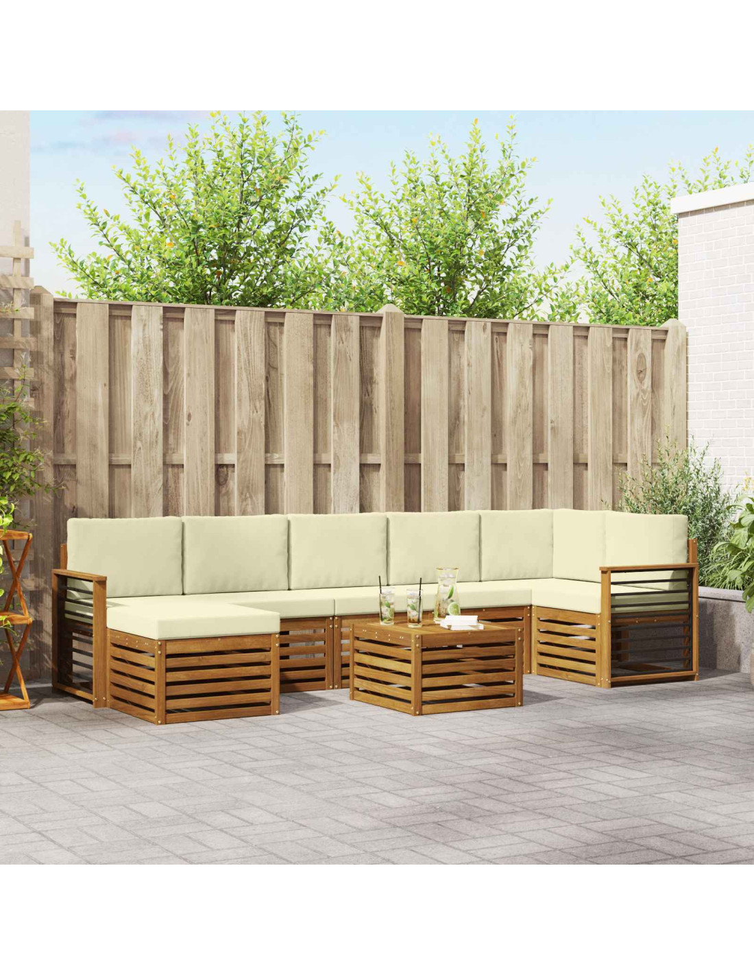Il set di mobili da esterno è unisce stile e praticità, creando un punto focale perfetto per ogni giardino o terrazzo. Il design moderno, con linee pulite e dettagli semplici, porta eleganza e favorisce il relax all'aperto e i momenti in compagnia. Fatto interamente in legno massello di acacia, offre durata e un fascino che dura nel tempo, rendendolo perfetto per chi cerca sia praticità che design per i mobili da esterno.