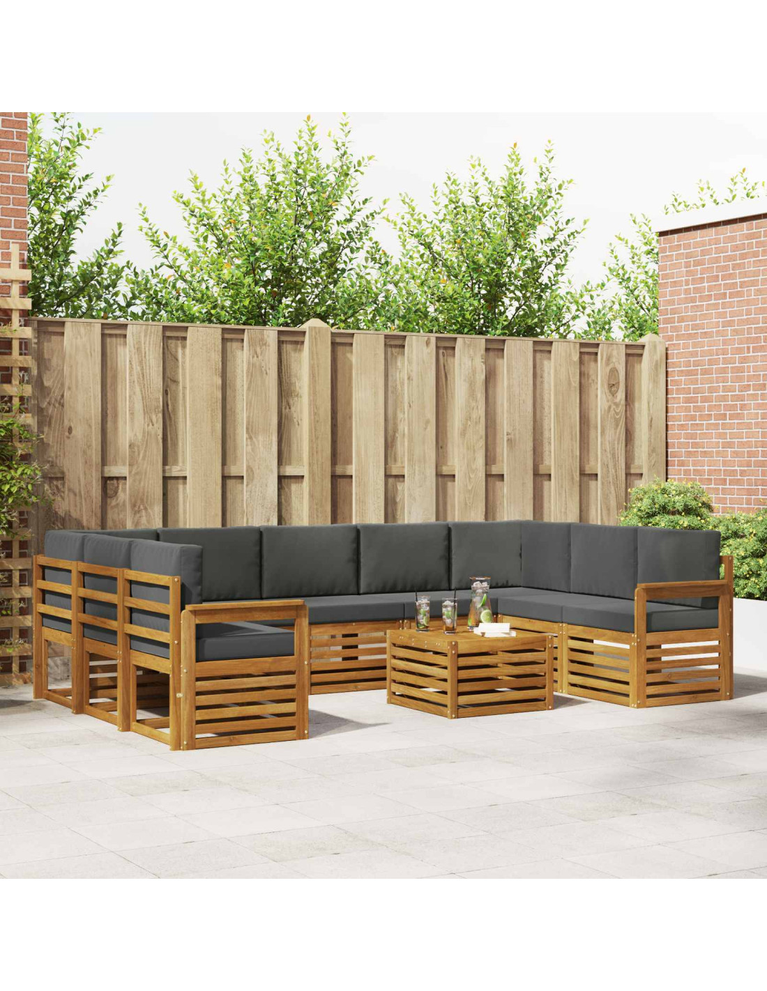 Il set di mobili da esterno unisce stile e praticità, diventando il punto focale di qualsiasi giardino o terrazza. Con il suo design moderno, dalle linee pulite e dettagli minimal, porta eleganza e favorisce momenti di relax e socialità all'aperto. Interamente in legno massello di acacia, è durevole e ha un richiamo visivo che dura nel tempo, rendendolo la scelta perfetta per chi cerca mobili da esterno belli e funzionali.