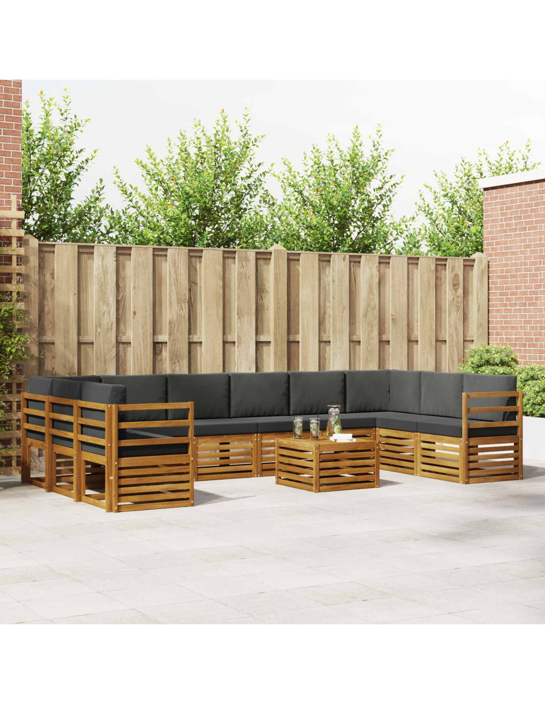 Il set di mobili da esterno unisce stile e funzionalità, creando un elemento centrale sorprendente per giardini o terrazze. Ha un design moderno con linee semplici e senza fronzoli, che aggiunge eleganza e invita a rilassarsi all'aperto e a socializzare. È fatto interamente di legno massello di acacia, garantendo durata e un aspetto luminoso, sempre perfetto per chi cerca praticità e stile nei mobili per esterni.
