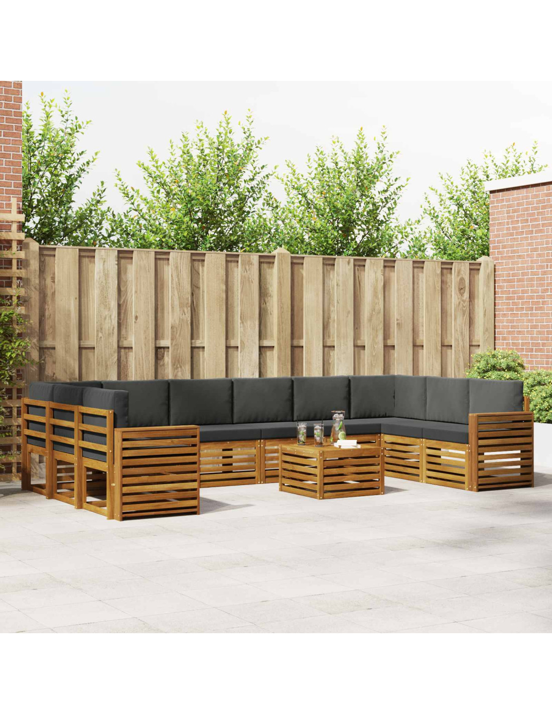 Il set di mobili da esterno unisce stile e funzionalità, creando un elemento centrale sorprendente per giardini o terrazze. Ha un design moderno con linee semplici e senza fronzoli, che aggiunge eleganza e invita a rilassarsi all'aperto e a socializzare. È fatto interamente di legno massello di acacia, garantendo durata e un aspetto luminoso, sempre perfetto per chi cerca praticità e stile nei mobili per esterni.