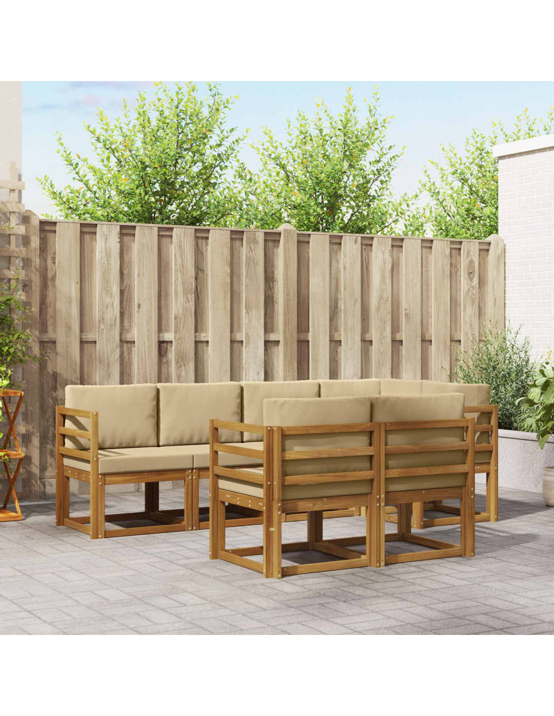 Il set di divani sezionali da esterno è una fantastica aggiunta a qualsiasi giardino, patio o area piscina. Realizzato in legno massello di acacia, offre sia durata che stile. Il design moderno è semplice e funzionale, perfetto per chi ama linee pulite e minimalismo. È eccellente sia per accogliere ospiti che per momenti di assoluto relax. Questo set garantisce comode sedute e si integra facilmente con qualsiasi ambiente esterno.