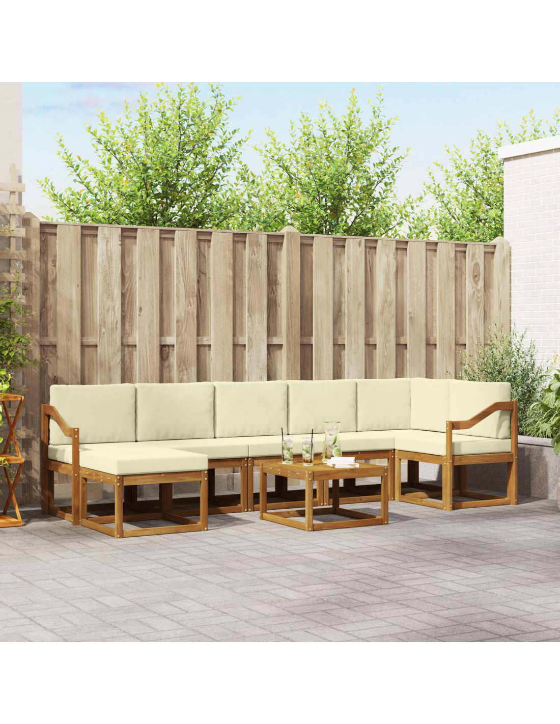 Questo set di divani modulari è un esempio di funzionalità moderna con le sue linee pulite e uno stile minimalista. Creato per la vita esterna, il set in legno massello di acacia si integra benissimo con la natura. Essendo completamente modulare, puoi riorganizzare i suoi pezzi come vuoi per il patio, il giardino o la zona piscina, rendendolo perfetto per rilassarsi o intrattenere qualsiasi contesto esterno. Ti invita a goderti il tuo spazio, trasformandolo in un'estensione versatile del tuo interno.