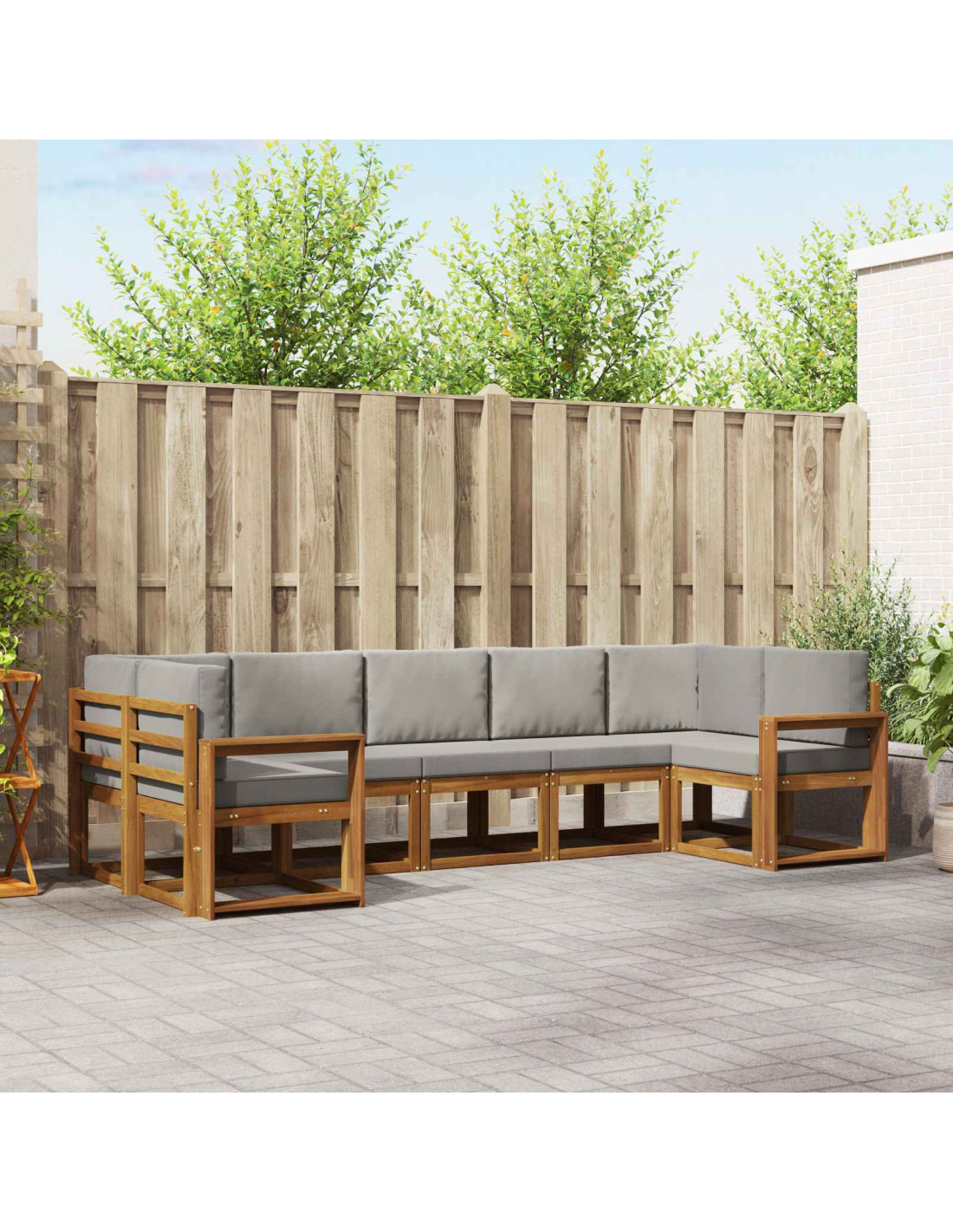 Questo set di divani modulari da esterno porta un'atmosfera moderna e semplice, perfettamente integrata in ogni giardino, patio o zona piscina. Il design modulare consente di creare varie configurazioni, rendendolo ideale per reunion familiari intime o eventi più grandi. Realizzato in legno massello di acacia, il set emana un fascino naturale, e il suo colore marrone si intona alla vegetazione circostante, creando un ambiente accogliente per il relax e la convivialità.