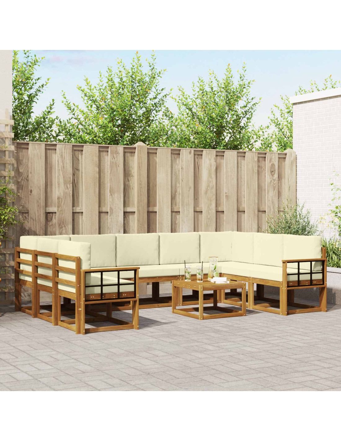 Questo set di divani sezionali per esterni è pensato per unire comfort ed estetica moderna, rendendolo il posto ideale per riunirsi nel tuo giardino, patio o vicino alla piscina. Ogni pezzo è realizzato in legno massello di acacia e mostra un design contemporaneo, con linee pulite e ornamenti minimi. È perfetto sia per incontri intimi che per eventi più grandi, e ti permette di riorganizzare i posti a sedere per ogni occasione. La sua calda tonalità marrone si integra bene con il verde della natura, aggiungendo un tocco elegante ai tuoi spazi esterni.