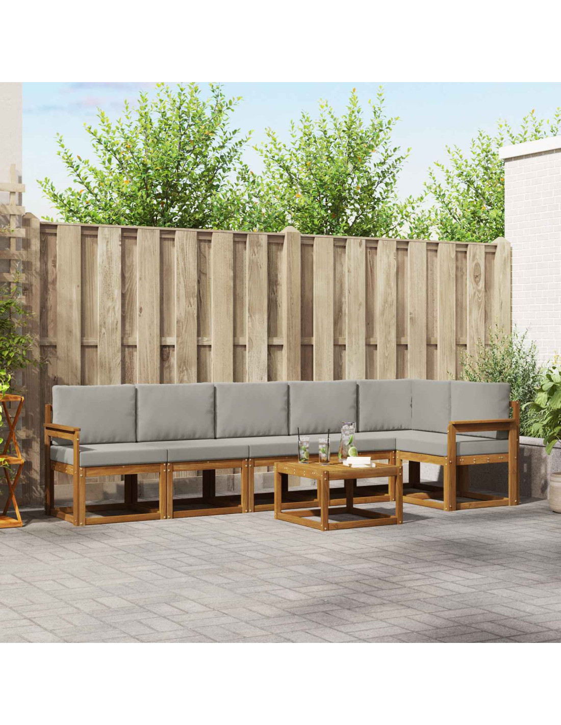 Questo set di divani modulari per esterni unisce design moderno e praticità, rendendolo un'ottima scelta per giardini o patii. Realizzato con cura in legno di acacia massello, il set ha un fascino elegante e rustico. La semplicità del design offre un'estetica versatile che si sposa bene con vari stili d'arredo esterni, arricchendo l'atmosfera, sia accanto alla piscina sia in un angolo tranquillo del giardino. Questo allestimento modulare si adatta a diverse configurazioni, rispondendo facilmente a varie esigenze di seduta e occasioni sociali. Gli schienali a doghe e le caratteristiche aggiuntive sono pensati per godere dei momenti all'aperto con comfort e stile.