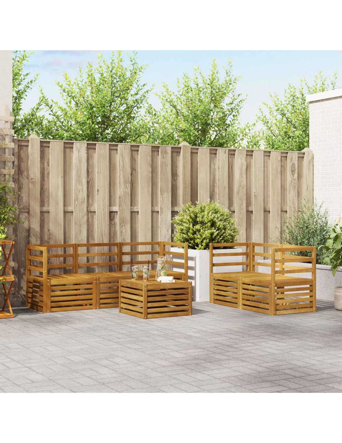 Il set di mobili da giardino unisce stile e funzionalità, creando un punto centrale fantastico per ogni giardino o terrazza. Con un design moderno caratterizzato da linee pulite e dettagli semplici, porta eleganza e invita al relax e alla convivialità all'aperto. Fatto completamente di legno massello di acacia, è resistente e ha un’attrattiva visiva duratura, perfetto per chi cerca praticità e un tocco di classe nei mobili da esterno.