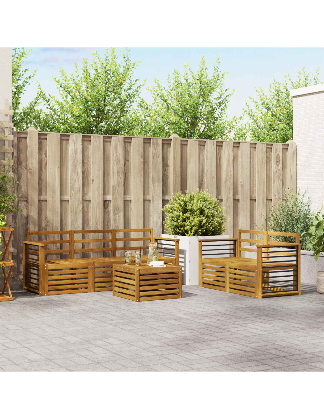 Il set di mobili da giardino unisce stile e funzionalità, creando un punto centrale fantastico per ogni giardino o terrazza. Con un design moderno caratterizzato da linee pulite e dettagli semplici, porta eleganza e invita al relax e alla convivialità all'aperto. Fatto completamente di legno massello di acacia, è resistente e ha un’attrattiva visiva duratura, perfetto per chi cerca praticità e un tocco di classe nei mobili da esterno.