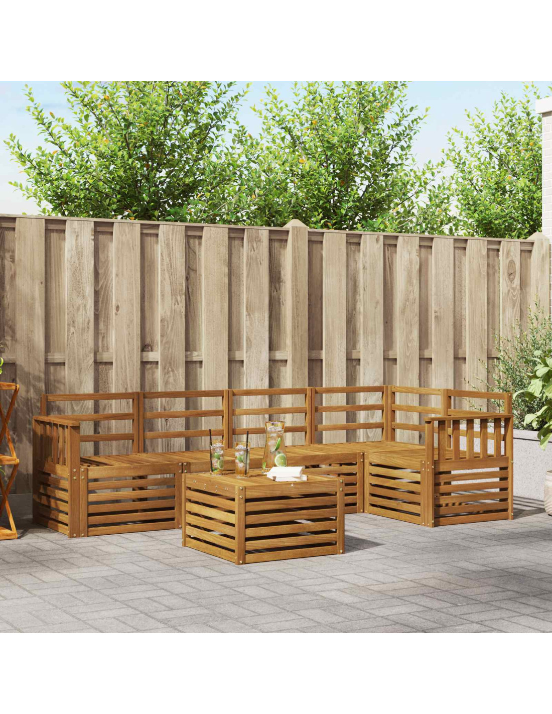 Il set di mobili da esterno unisce stile e praticità, creando un punto focale sorprendente per il tuo giardino o terrazza. Il design moderno, con linee semplici e dettagli minimi, aggiunge eleganza, perfetta per il relax e le riunioni all'aperto. Fatto interamente in legno massello di acacia, questo set è durevole e visivamente attraente, la scelta giusta per chi cerca praticità e design raffinato nei mobili esterni.