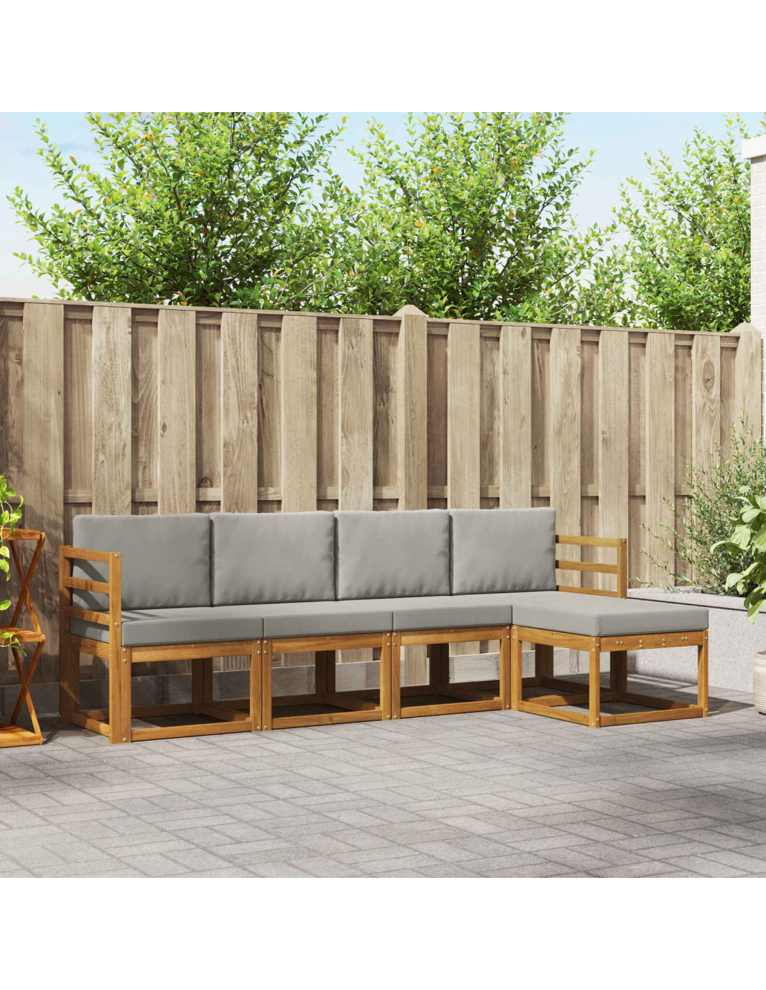 - Materiali: Ogni pezzo è fatto in legno massello di acacia robusto, rinomato per la sua resistenza e durevolezza, che richiede poca manutenzione. La grana fine e il colore caldo del legno aggiungono un tocco lussuoso a qualsiasi spazio esterno.
