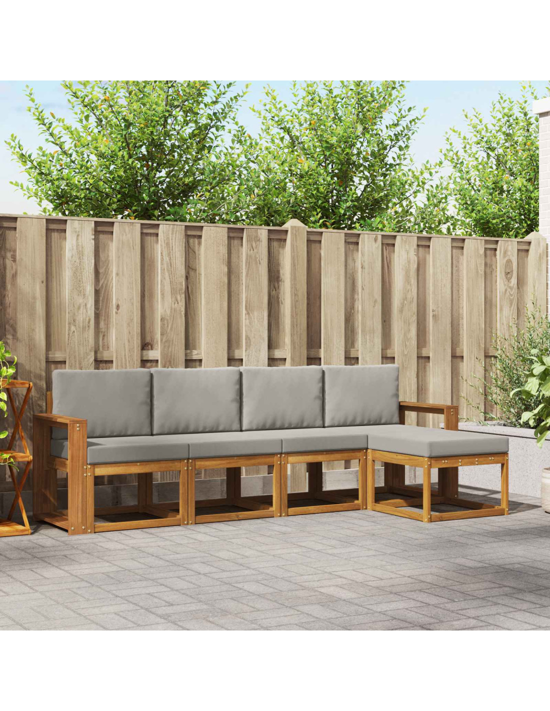 - Materiali: Ogni pezzo è fatto in legno massello di acacia robusto, rinomato per la sua resistenza e durevolezza, che richiede poca manutenzione. La grana fine e il colore caldo del legno aggiungono un tocco lussuoso a qualsiasi spazio esterno.