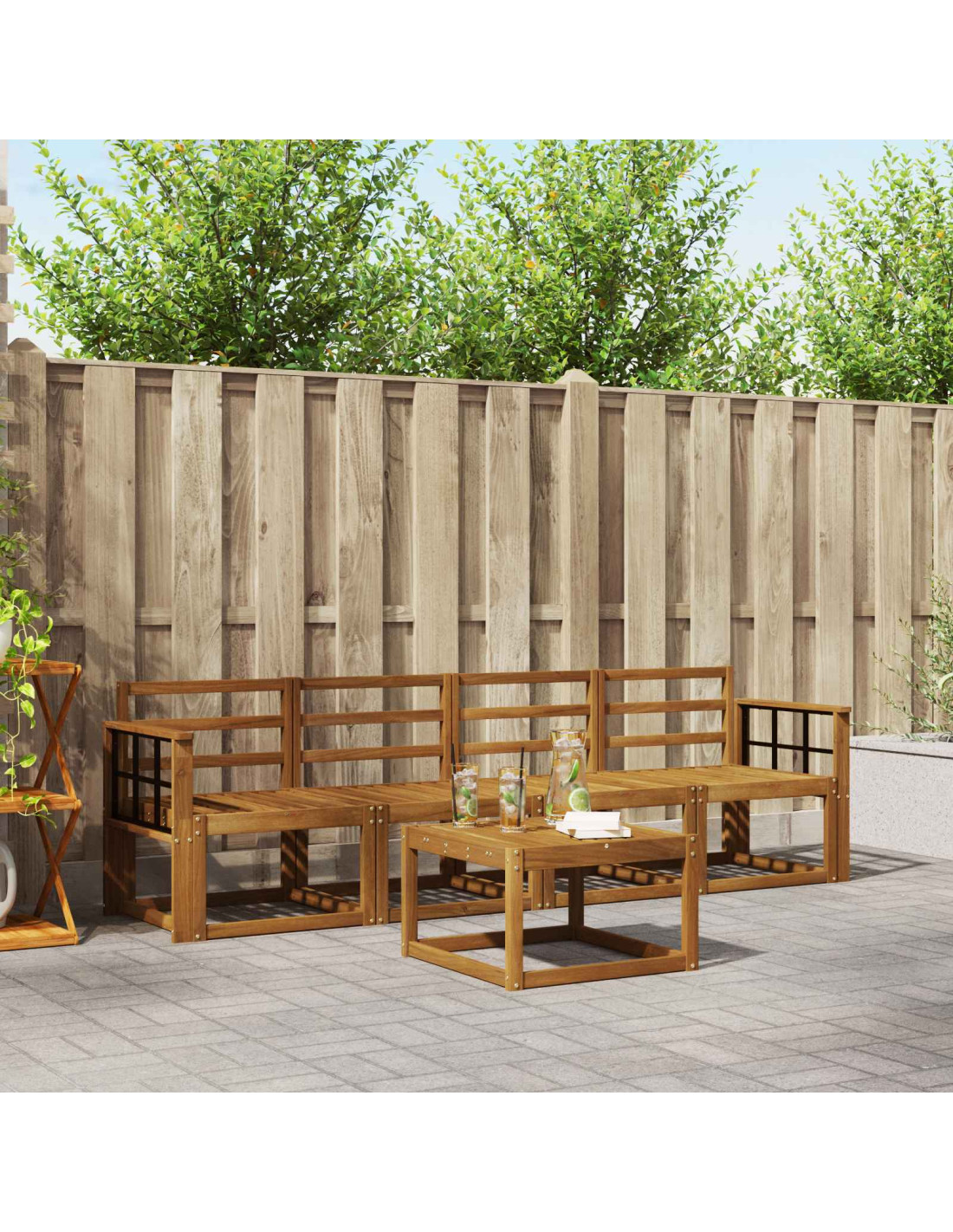 Il set di mobili per esterni è la fusione perfetta di stile e praticità, creando un centro d'attenzione per qualsiasi giardino o terrazzo. Il design moderno e lineare aggiunge un tocco di eleganza, facilitando momenti di relax all'aperto e socialità. Completamente realizzato in legno massello di acacia, questo set è robusto e presenta un aspetto che dura nel tempo, rendendolo ideale per chi cerca praticità e un design raffinato.