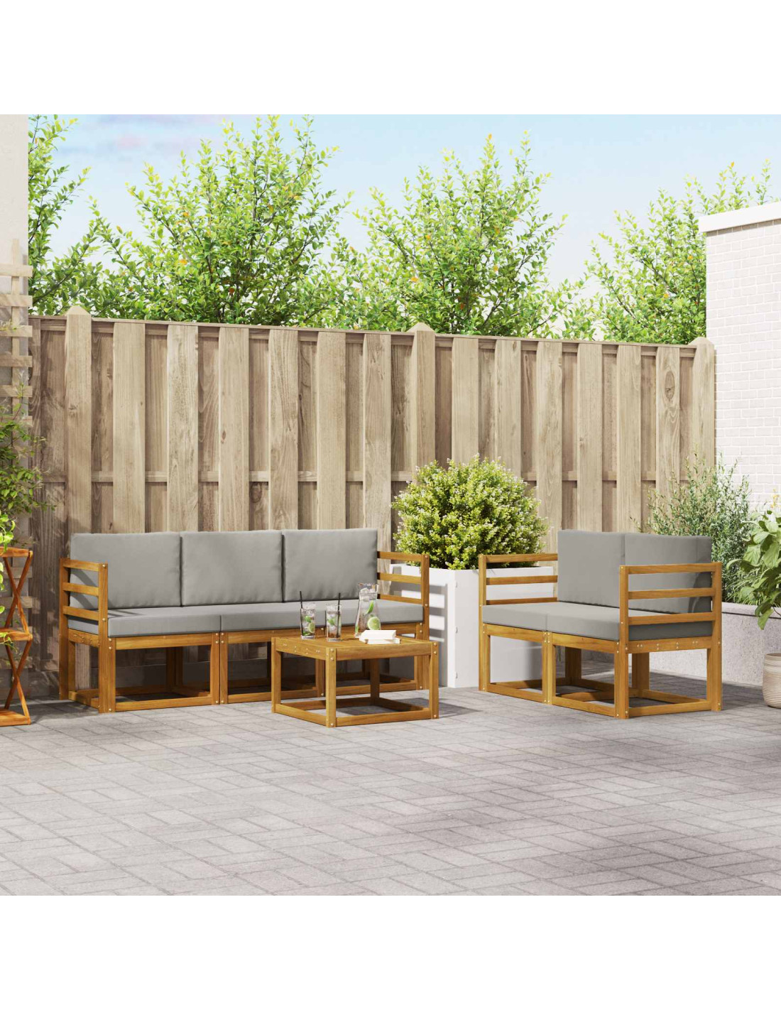 Questo set di mobili per esterni fonde stile e funzionalità, creando un colpo d'occhio bello per ogni giardino o terrazza. Con un design moderno, fatto di linee pulite e pochi dettagli, aggiunge eleganza e favorisce momenti di relax e socialità all'aperto. Interamente in legno massello di acacia, questo set è duro e dal fascino duraturo, l'ideale per chi cerca praticità e un tocco di classe nei mobili da esterno.