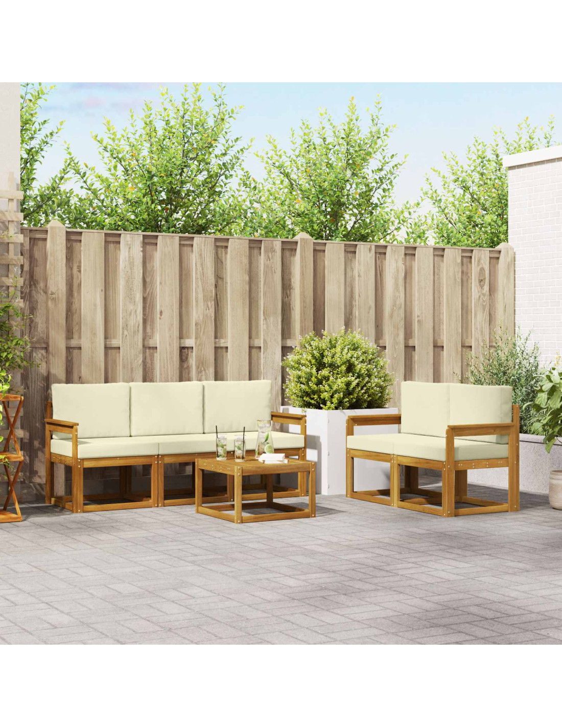 Questo set di mobili per esterni fonde stile e funzionalità, creando un colpo d'occhio bello per ogni giardino o terrazza. Con un design moderno, fatto di linee pulite e pochi dettagli, aggiunge eleganza e favorisce momenti di relax e socialità all'aperto. Interamente in legno massello di acacia, questo set è duro e dal fascino duraturo, l'ideale per chi cerca praticità e un tocco di classe nei mobili da esterno.