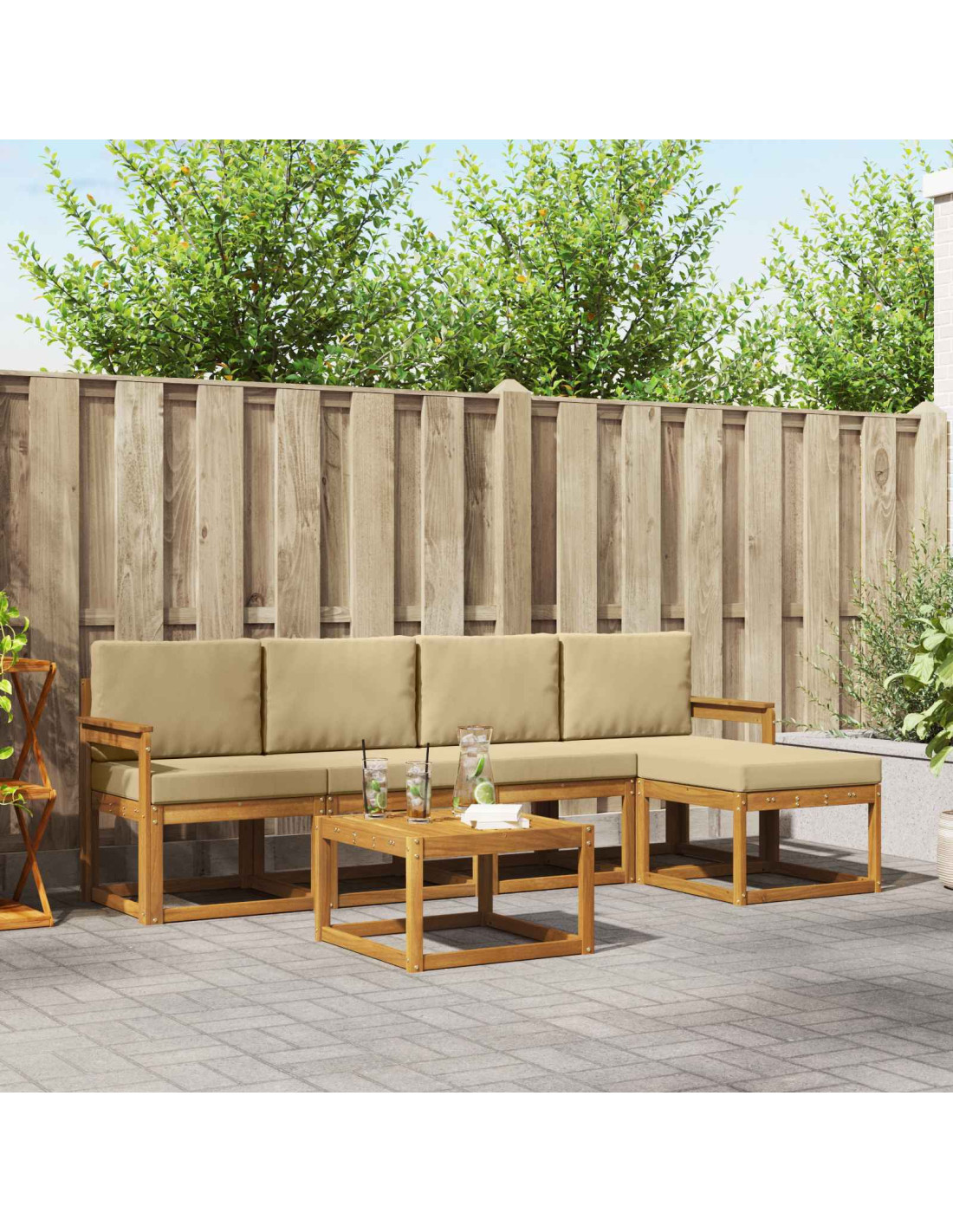 Questo set di divani modulari da esterno è la scelta giusta per chi cerca un mix di eleganza contemporanea e praticità. Pensato per l'uso all'aperto, il suo design semplice ed elegante riflette il calore del legno massello di acacia. Che tu lo metta sul tuo patio o sulla terrazza, questo set trasformerà qualsiasi giardino in un'oasi serena, grazie al suo look accogliente e al layout funzionale. È perfetto per le famiglie o gli ospiti: il design strutturato offre comfort e bellezza, invitando tutti a restare più a lungo e godersi piacevoli pomeriggi insieme.