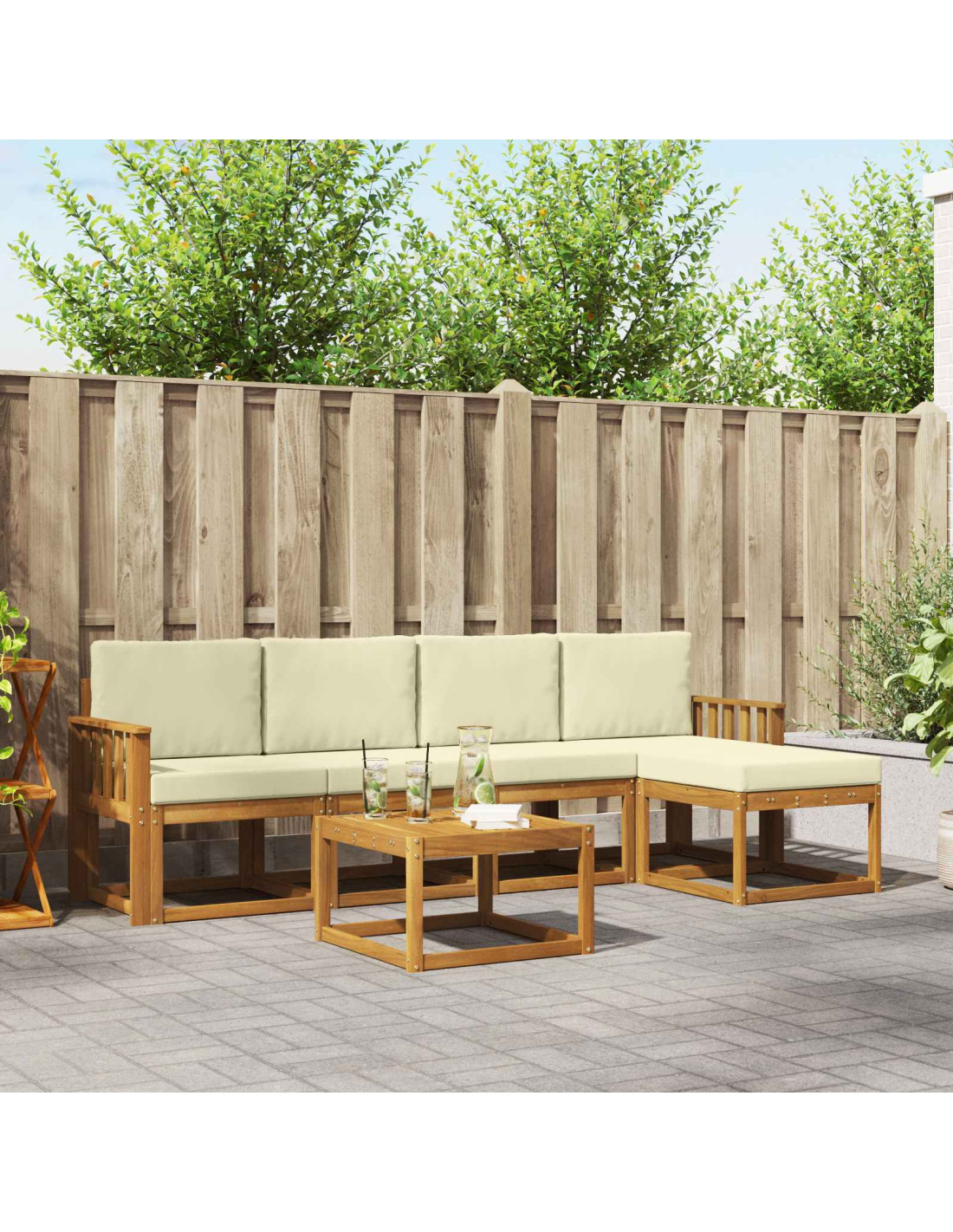 Questo set di divani modulari da esterno è la scelta giusta per chi cerca un mix di eleganza contemporanea e praticità. Pensato per l'uso all'aperto, il suo design semplice ed elegante riflette il calore del legno massello di acacia. Che tu lo metta sul tuo patio o sulla terrazza, questo set trasformerà qualsiasi giardino in un'oasi serena, grazie al suo look accogliente e al layout funzionale. È perfetto per le famiglie o gli ospiti: il design strutturato offre comfort e bellezza, invitando tutti a restare più a lungo e godersi piacevoli pomeriggi insieme.