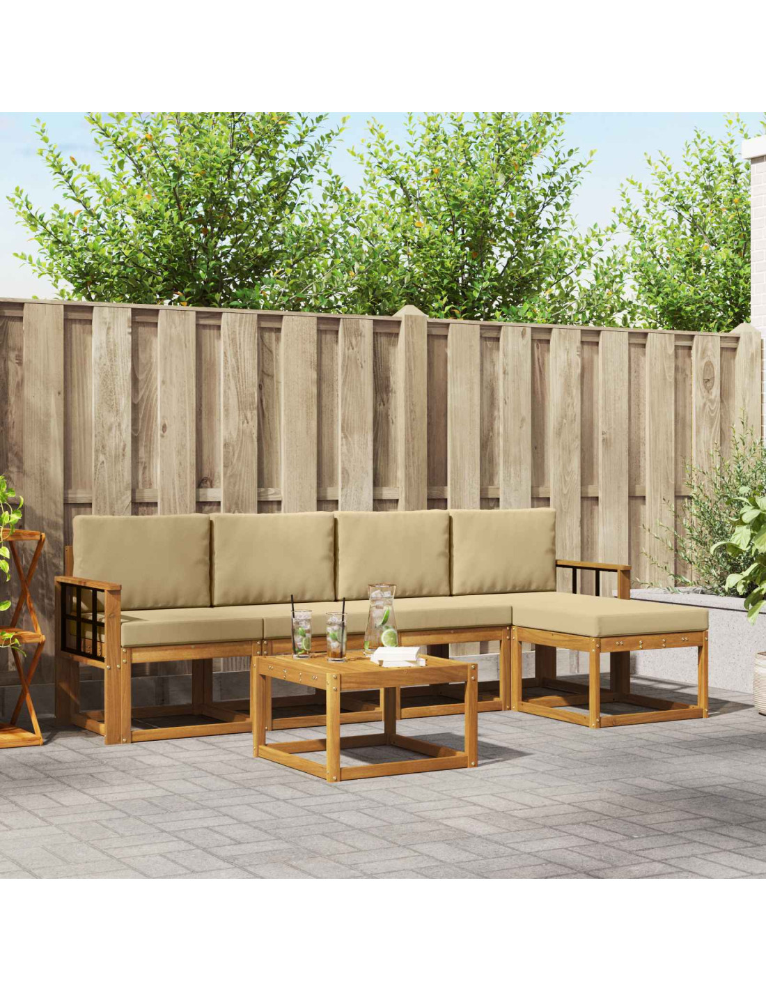 Questo set di divani modulari da esterno è la scelta giusta per chi cerca un mix di eleganza contemporanea e praticità. Pensato per l'uso all'aperto, il suo design semplice ed elegante riflette il calore del legno massello di acacia. Che tu lo metta sul tuo patio o sulla terrazza, questo set trasformerà qualsiasi giardino in un'oasi serena, grazie al suo look accogliente e al layout funzionale. È perfetto per le famiglie o gli ospiti: il design strutturato offre comfort e bellezza, invitando tutti a restare più a lungo e godersi piacevoli pomeriggi insieme.