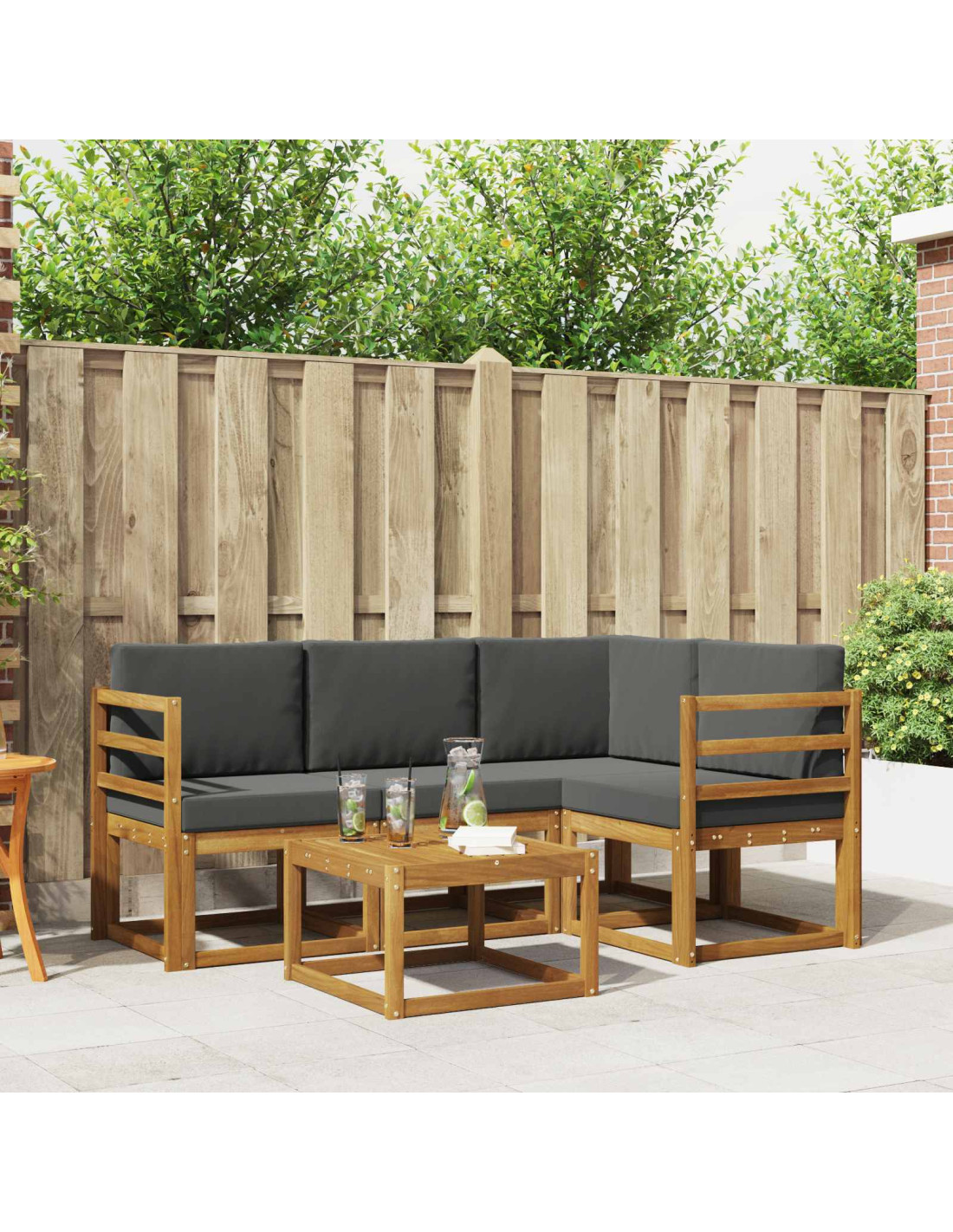 Il set di mobili da esterno unisce stile e funzionalità, creando un punto di attrazione per giardini o terrazze. Il design moderno, con linee semplici e dettagli minimi, porta eleganza e favorisce il relax all'aperto e incontri sociali. Realizzato in legno massello di acacia, il set è resistente e dal fascino senza tempo, rendendolo una scelta ideale per chi cerca praticità e bellezza nei mobili esterni.