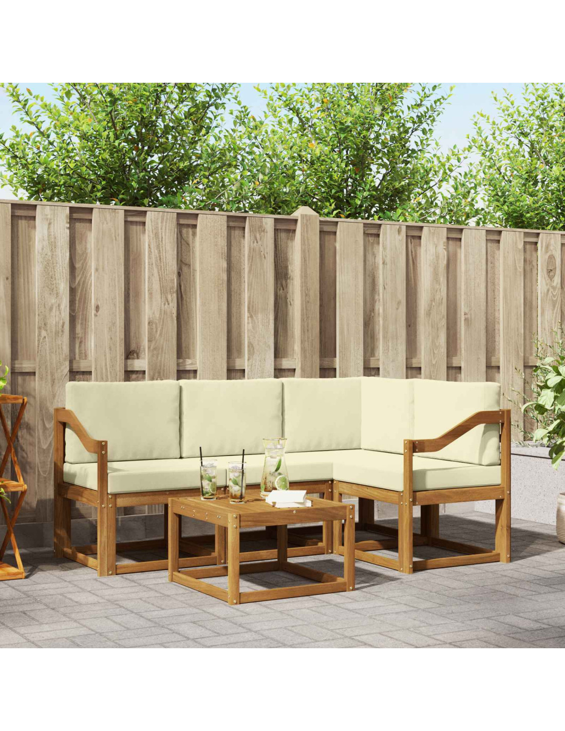 Il set di mobili da esterno unisce stile e funzionalità, creando un punto di attrazione per giardini o terrazze. Il design moderno, con linee semplici e dettagli minimi, porta eleganza e favorisce il relax all'aperto e incontri sociali. Realizzato in legno massello di acacia, il set è resistente e dal fascino senza tempo, rendendolo una scelta ideale per chi cerca praticità e bellezza nei mobili esterni.
