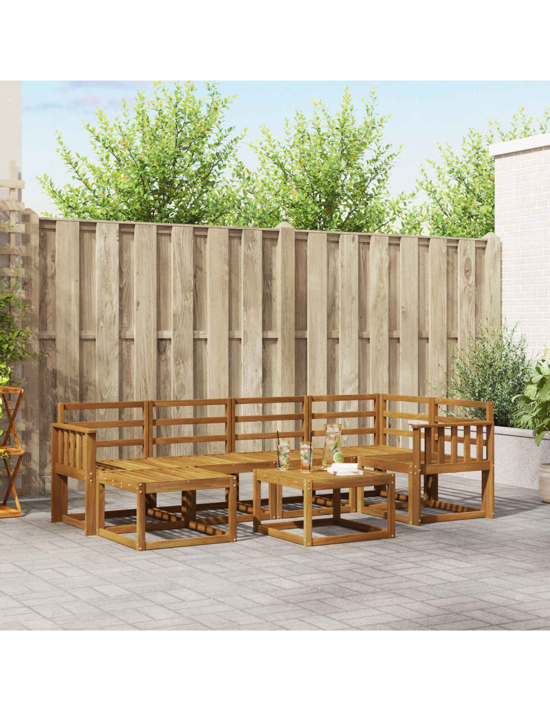 Il set di mobili da esterno è un mix di stile e funzionalità, perfetto per qualsiasi giardino o terrazza. Il design moderno, con linee pulite e dettagli semplici, porta eleganza e favorisce il relax all'aperto. Realizzato in legno massello di acacia, questo set garantisce durata nel tempo e rimane bello da vedere, rendendolo la scelta ideale per chi cerca praticità e un tocco di design nei mobili da esterno.
