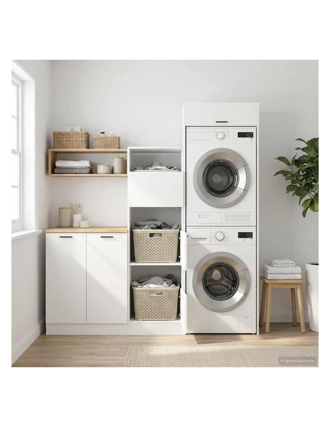 Scopri la modernità con questo set di armadi per lavanderia, pensato per rendere la tua routine più facile e organizzata. Con linee pulite e materiali in legno ingegnerizzato, si inserisce perfettamente in qualsiasi ambiente contemporaneo, come bagni o lavanderie. È la soluzione ideale per contenere cesti della biancheria e lavatrici senza rinunciare allo stile.
