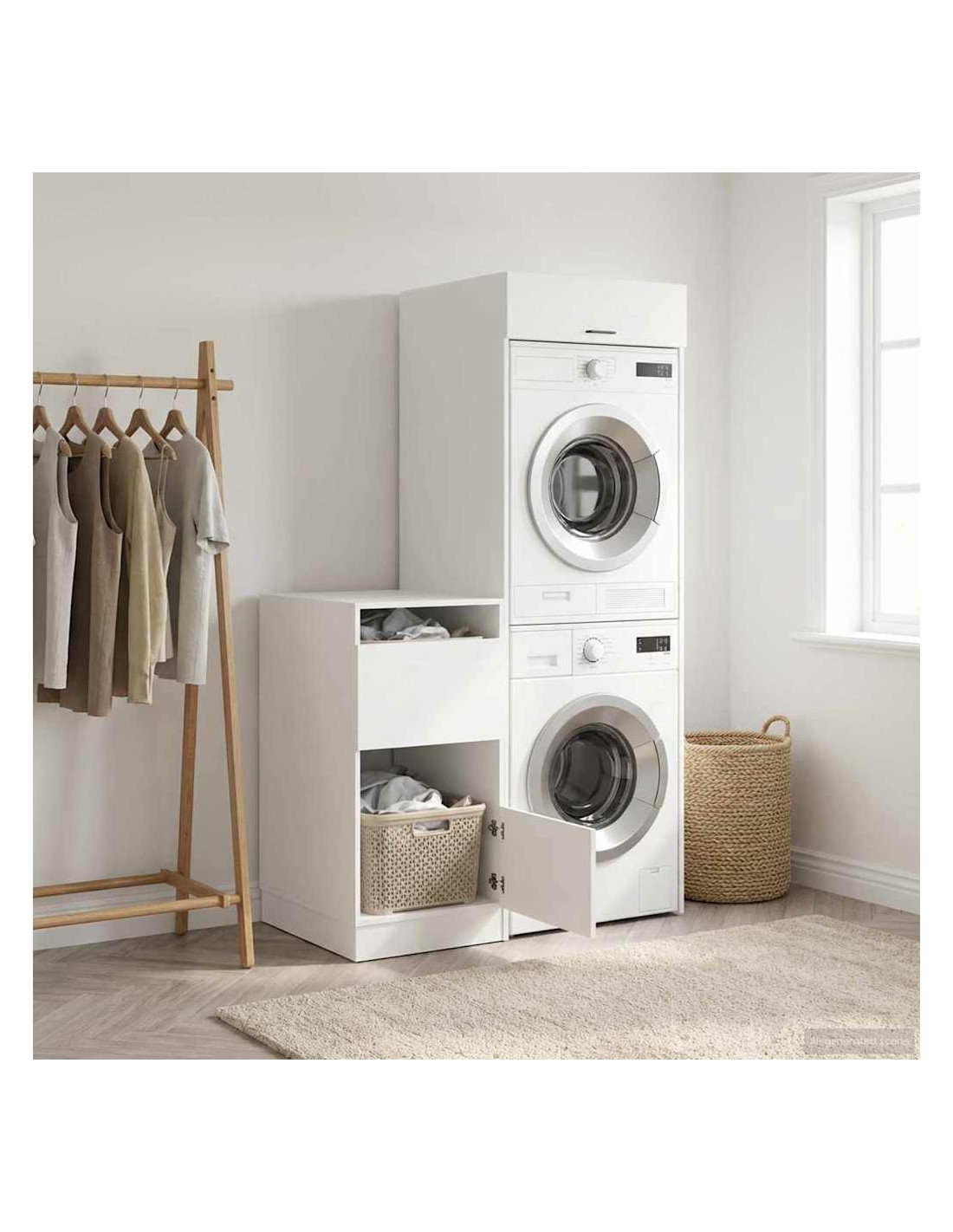 Scopri la modernità con questo set di armadi per lavanderia, pensato per rendere la tua routine più facile e organizzata. Con linee pulite e materiali in legno ingegnerizzato, si inserisce perfettamente in qualsiasi ambiente contemporaneo, come bagni o lavanderie. È la soluzione ideale per contenere cesti della biancheria e lavatrici senza rinunciare allo stile.