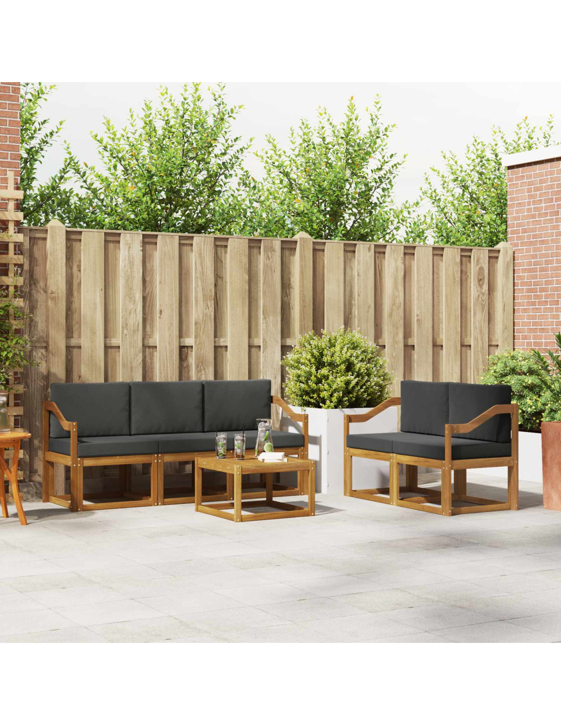Questo set di mobili per esterni fonde stile e funzionalità, creando un colpo d'occhio bello per ogni giardino o terrazza. Con un design moderno, fatto di linee pulite e pochi dettagli, aggiunge eleganza e favorisce momenti di relax e socialità all'aperto. Interamente in legno massello di acacia, questo set è duro e dal fascino duraturo, l'ideale per chi cerca praticità e un tocco di classe nei mobili da esterno.