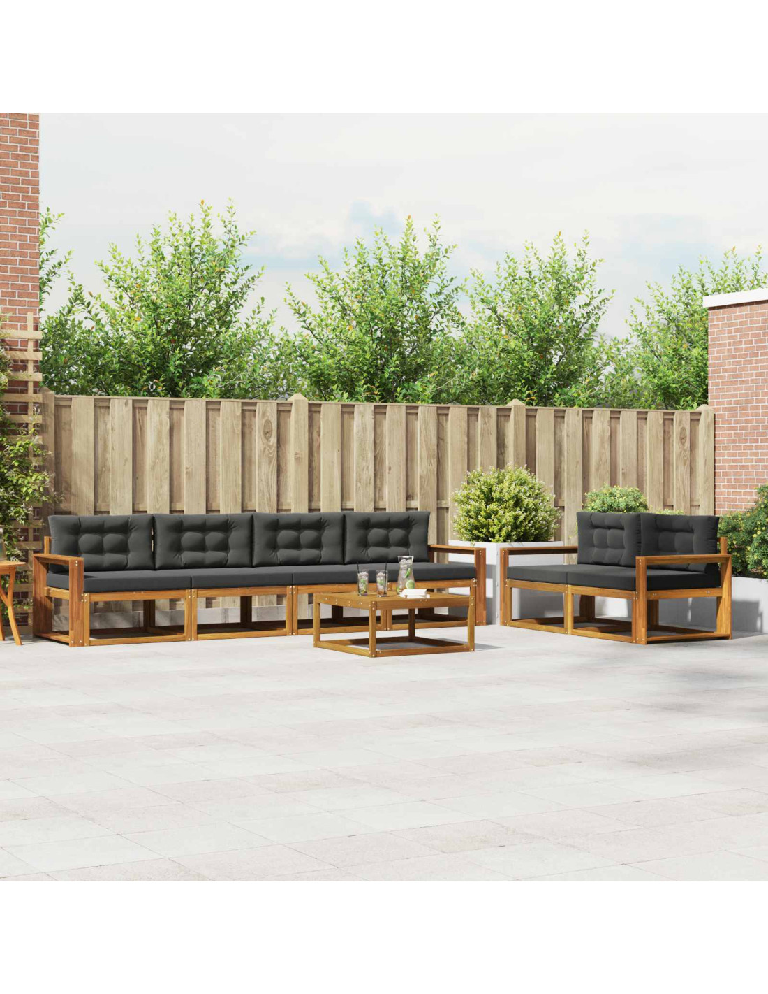 - Legno massello di Acacia: Costruito con legno massello di Acacia, questo set è noto per la sua resistenza e naturale capacità di resistere agli agenti atmosferici. Le calde nuances del legno ne esaltano il fascino, unendo lusso e durabilità in ogni spazio esterno.