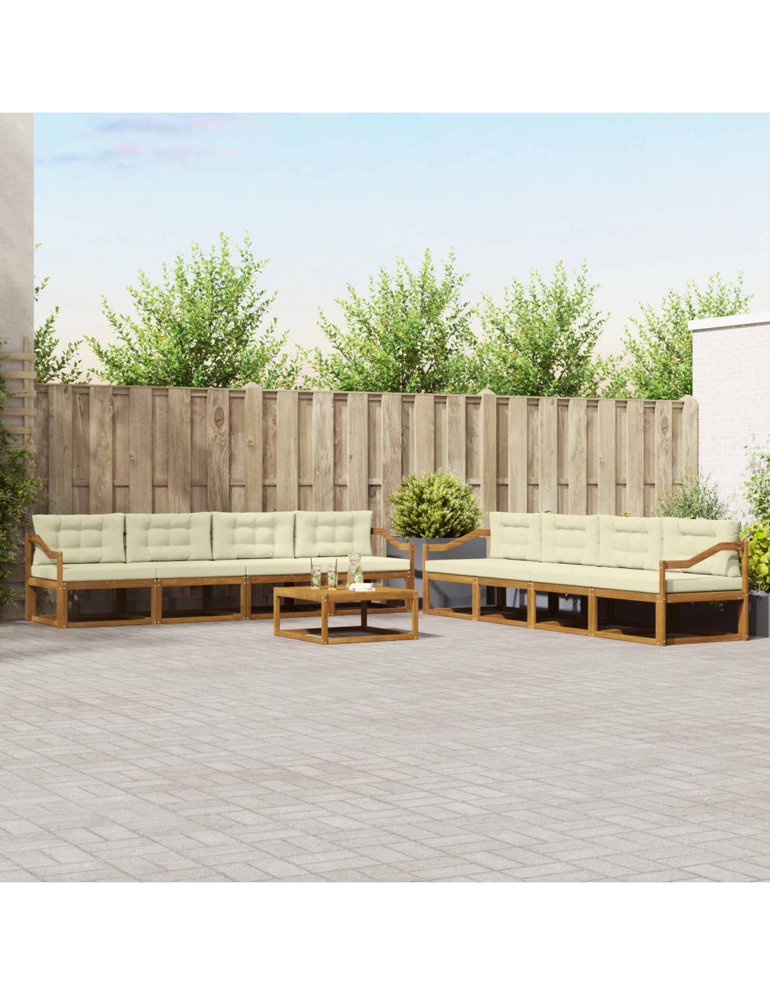 - Composizione in legno di acacia: Questo set di divani è fatto in legno massello di acacia, famoso per la sua resistenza e bellezza naturale. La sua grana elegante e il colore caldo si integrano perfettamente con l'ambiente esterno, aggiungendo un tocco di rusticità.