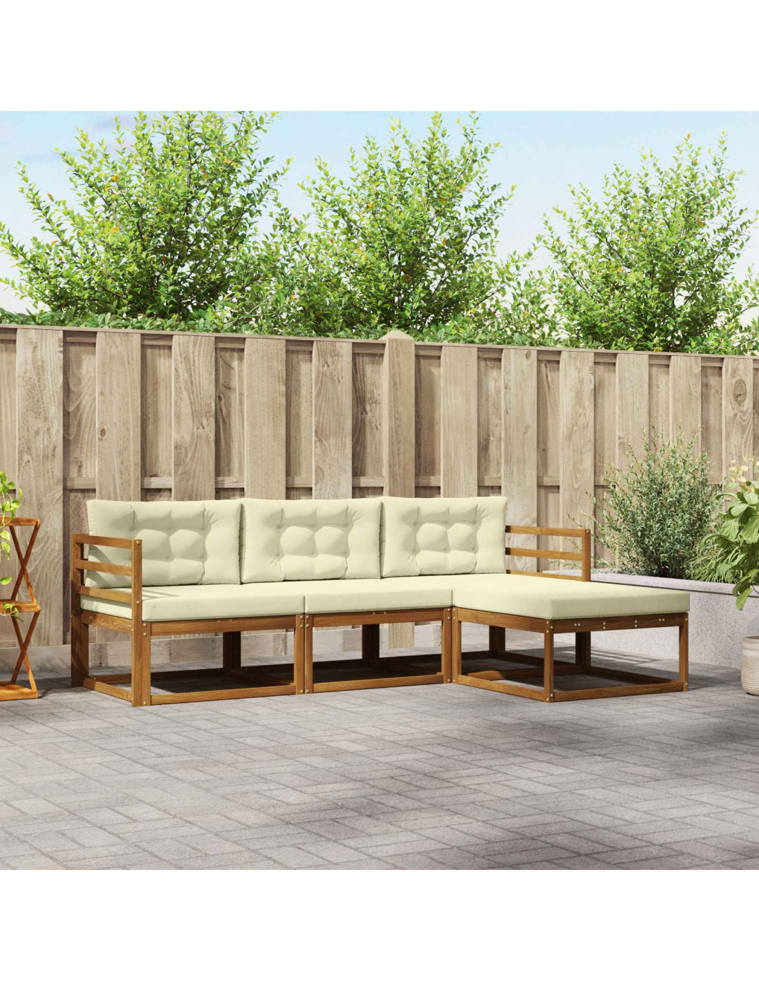 - Costruzione in legno massello di acacia Questo set di divani modulari è fatto in legno massello di acacia, noto perché è resistente e si adatta perfettamente all'esterno. La calda finitura marrone si integra con qualsiasi stile di arredo esterno, mentre la sua natura resistente assicura che i mobili rimangano belli e forti nel tempo. Il legno massello di acacia aggiunge un tocco di rusticità senza tempo al tuo spazio.