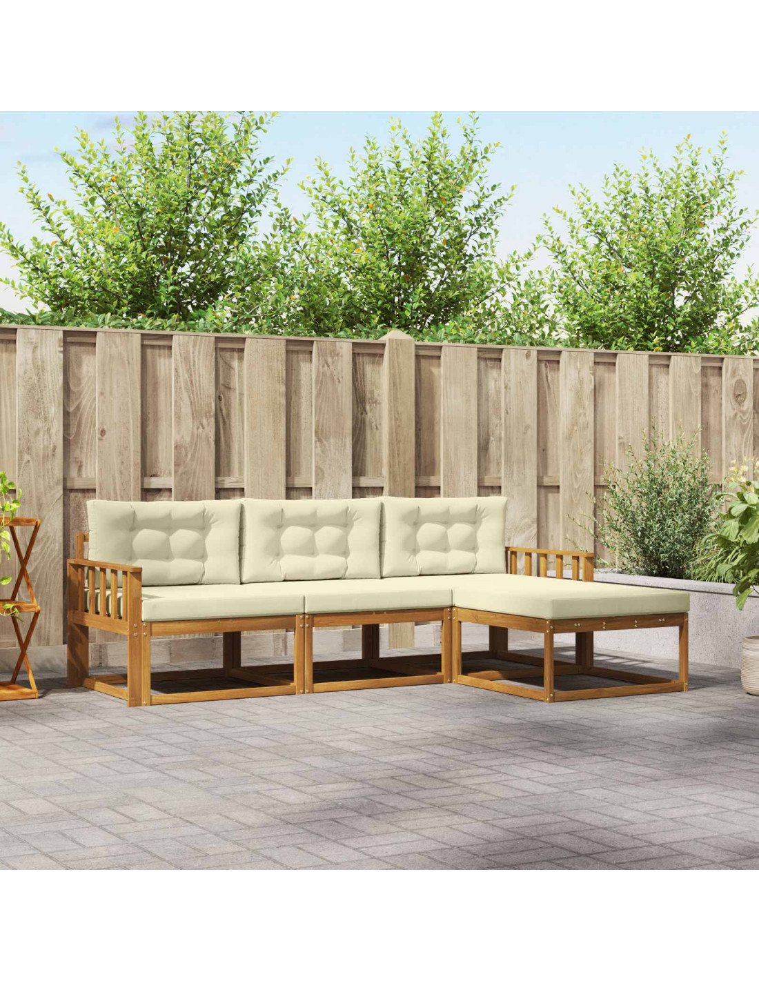 - Costruzione in legno massello di acacia Questo set di divani modulari è fatto in legno massello di acacia, noto perché è resistente e si adatta perfettamente all'esterno. La calda finitura marrone si integra con qualsiasi stile di arredo esterno, mentre la sua natura resistente assicura che i mobili rimangano belli e forti nel tempo. Il legno massello di acacia aggiunge un tocco di rusticità senza tempo al tuo spazio.