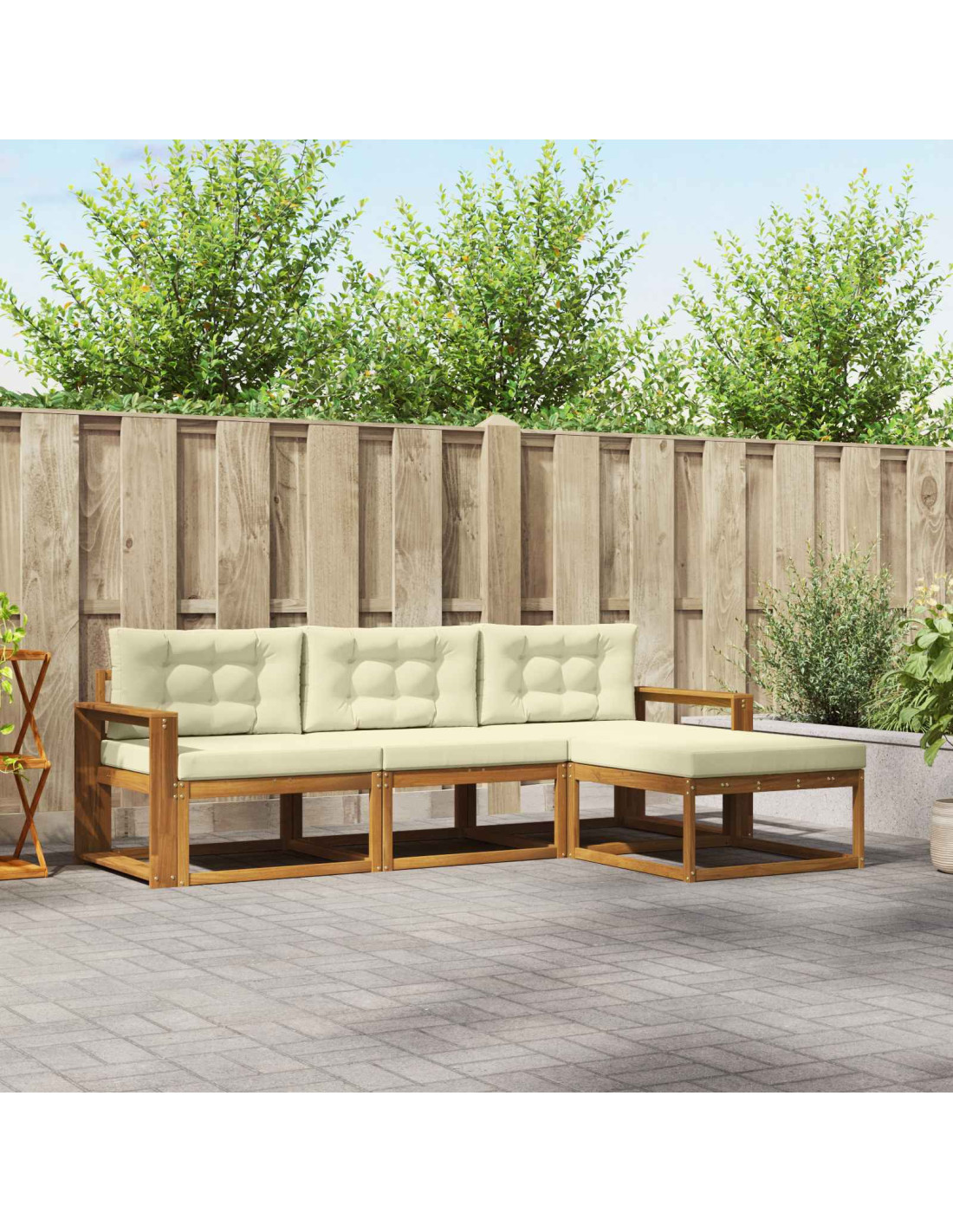 - Costruzione in legno massello di acacia Questo set di divani modulari è fatto in legno massello di acacia, noto perché è resistente e si adatta perfettamente all'esterno. La calda finitura marrone si integra con qualsiasi stile di arredo esterno, mentre la sua natura resistente assicura che i mobili rimangano belli e forti nel tempo. Il legno massello di acacia aggiunge un tocco di rusticità senza tempo al tuo spazio.