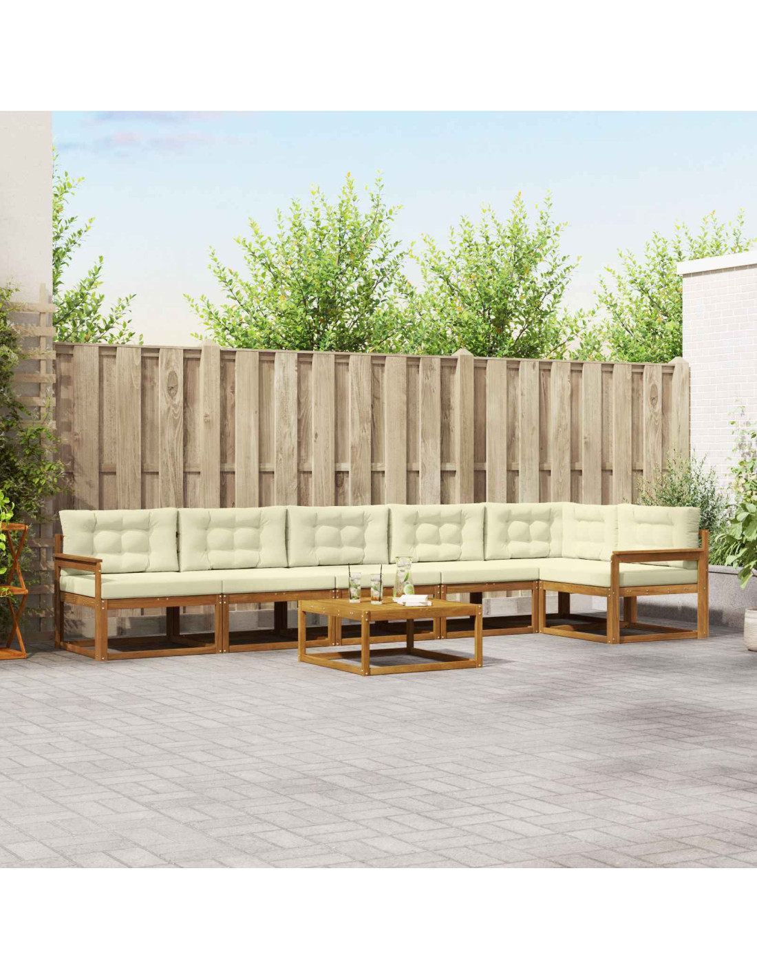 Questo elegante Outdoor Sectional Sofa Set unisce stile e funzionalità, perfetto per valorizzare qualsiasi giardino o patio. Con un design semplice, il legno di acacia gli conferisce un aspetto caldo e accogliente, ideale per riunioni familiari o serate tranquille all'aperto. Le linee pulite e il design minimale creano un'atmosfera contemporanea, ideale per ogni spazio esterno. Approfitta dell'equilibrio tra materiali resistenti e design bello, perfetto per accogliere amici o per goderti una serata tranquilla nel tuo giardino.