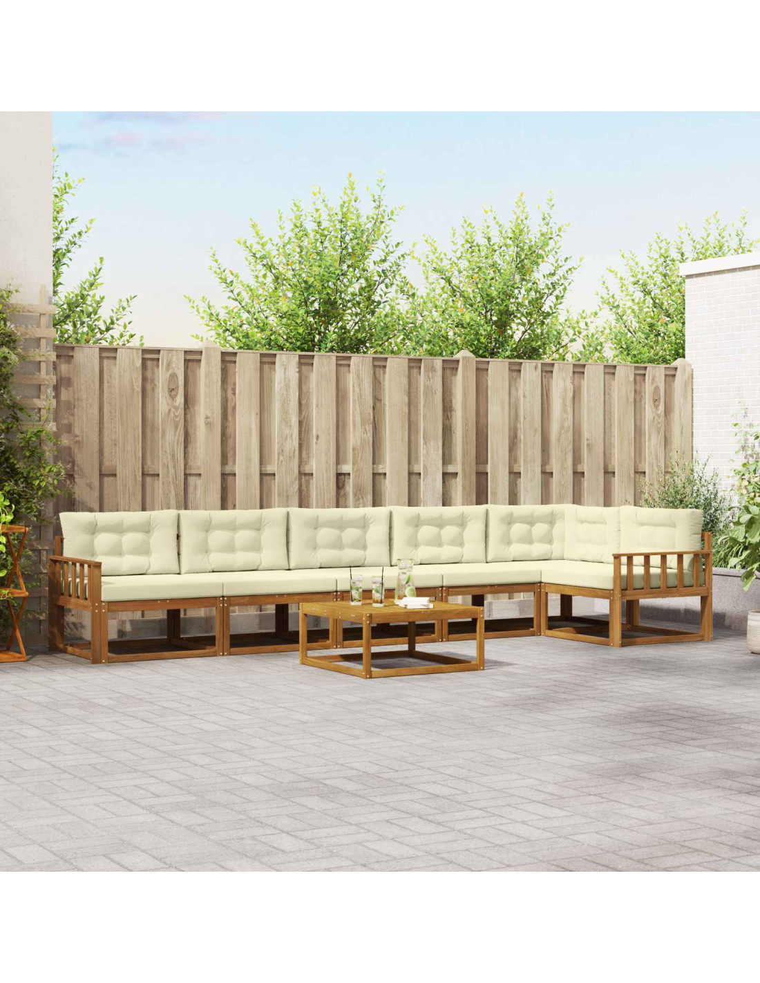 Questo elegante Outdoor Sectional Sofa Set unisce stile e funzionalità, perfetto per valorizzare qualsiasi giardino o patio. Con un design semplice, il legno di acacia gli conferisce un aspetto caldo e accogliente, ideale per riunioni familiari o serate tranquille all'aperto. Le linee pulite e il design minimale creano un'atmosfera contemporanea, ideale per ogni spazio esterno. Approfitta dell'equilibrio tra materiali resistenti e design bello, perfetto per accogliere amici o per goderti una serata tranquilla nel tuo giardino.
