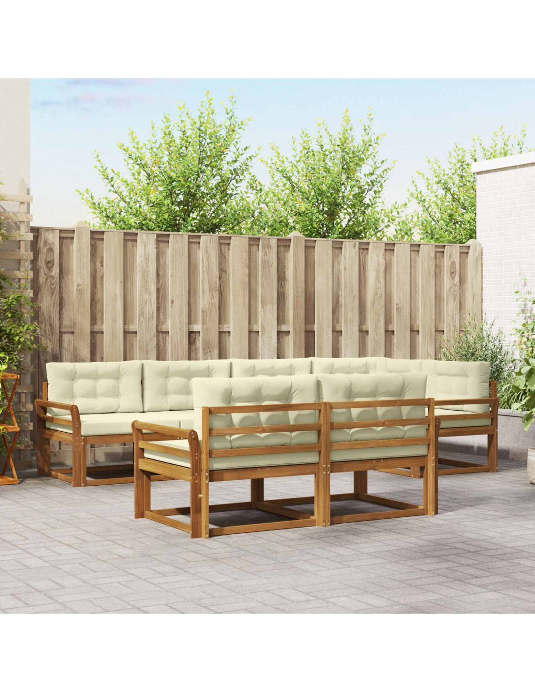 Questo set di sofà sezionale da esterno unisce stile e versatilità, trasformando qualsiasi giardino, patio o area piscina in un angolo accogliente. Grazie al design modulare, puoi adattarlo come vuoi, a seconda del tuo spazio e dei tuoi gusti. Il set ha un caldo colore marrone e la bellezza del legno massello di acacia, che offre sia un aspetto attraente che durata nel tempo.