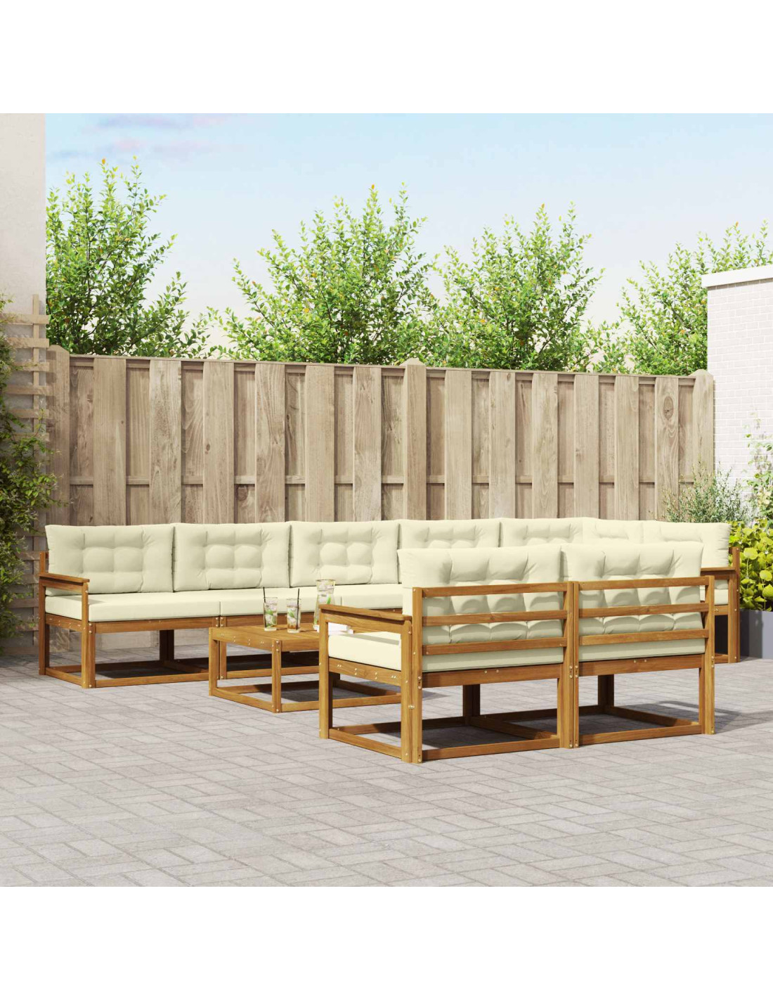 Questo outdoor sectional sofa set è un'aggiunta super trendy al tuo giardino o patio. Con il suo design moderno e lineare, è pensato per garantire comfort e socialità in ogni spazio esterno. Realizzato in legno massello di acacia, unisce praticità e bellezza con un layout modulare che puoi facilmente adattare a diverse esigenze.
