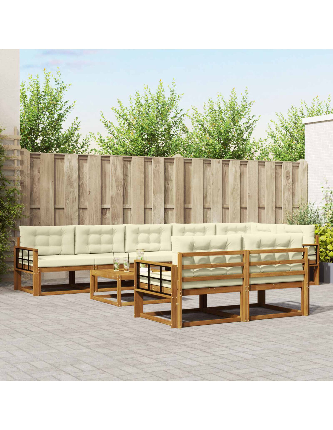 Questo outdoor sectional sofa set è un'aggiunta super trendy al tuo giardino o patio. Con il suo design moderno e lineare, è pensato per garantire comfort e socialità in ogni spazio esterno. Realizzato in legno massello di acacia, unisce praticità e bellezza con un layout modulare che puoi facilmente adattare a diverse esigenze.