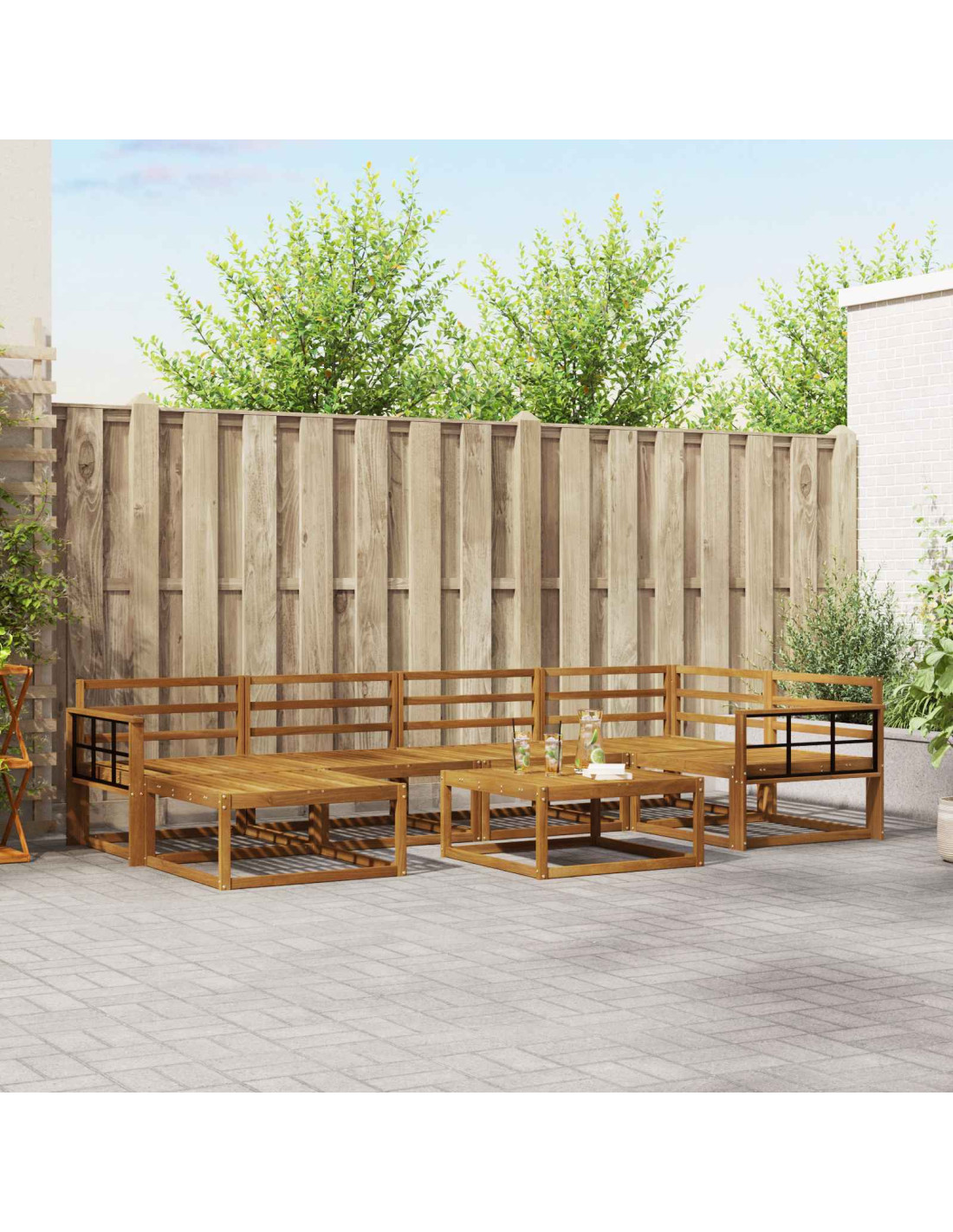 - Componenti inclusi: Questo set include una struttura a doghe fisse con materiali robusti, garantendo posti a sedere solidi e confortevoli. Lo schienale e i braccioli in legno di acacia si integrano perfettamente nel design, migliorando comfort e aspetto. Ogni parte offre supporto efficace per ore di relax nel tuo giardino o vicino alla piscina.