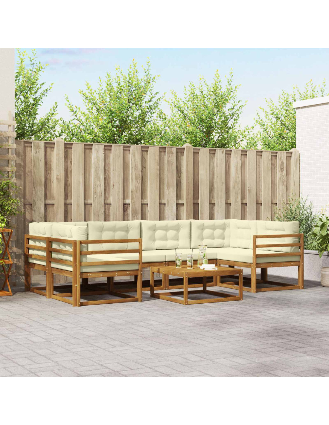 - Materiali: Questo set di divani è fatto in legno massello di acacia, che non è solo bello ma anche resistente. Il legno tiene bene all'aperto e mantiene il suo fascino nel tempo.