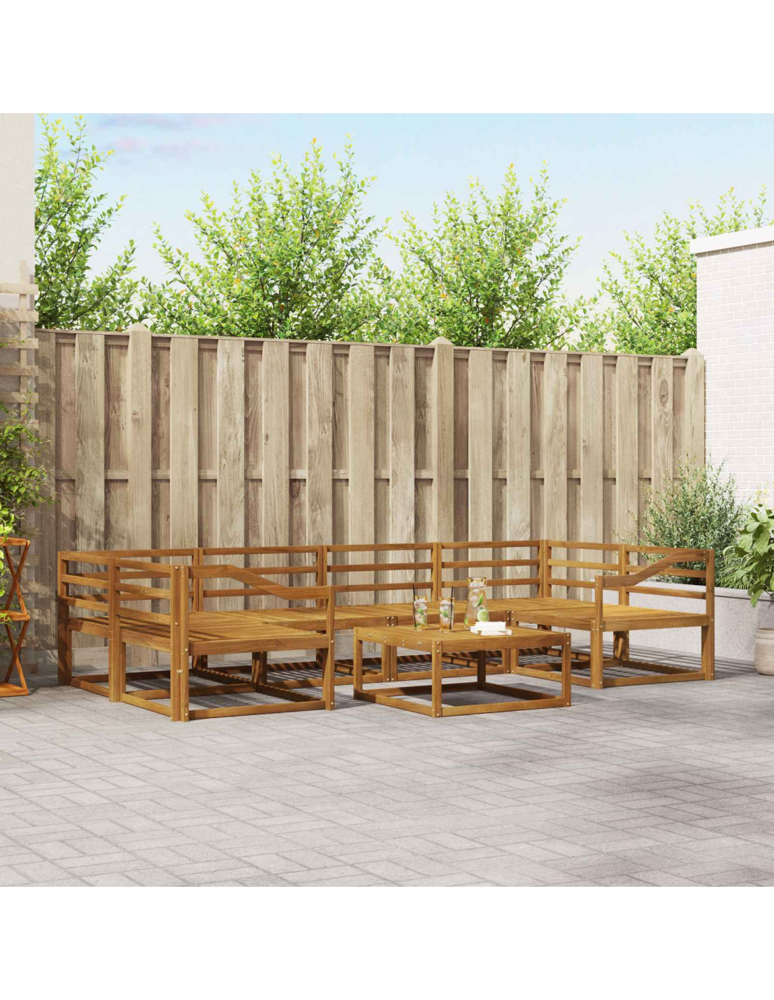 - Materiali: Questo set di divani è fatto in legno massello di acacia, che non è solo bello ma anche resistente. Il legno tiene bene all'aperto e mantiene il suo fascino nel tempo.