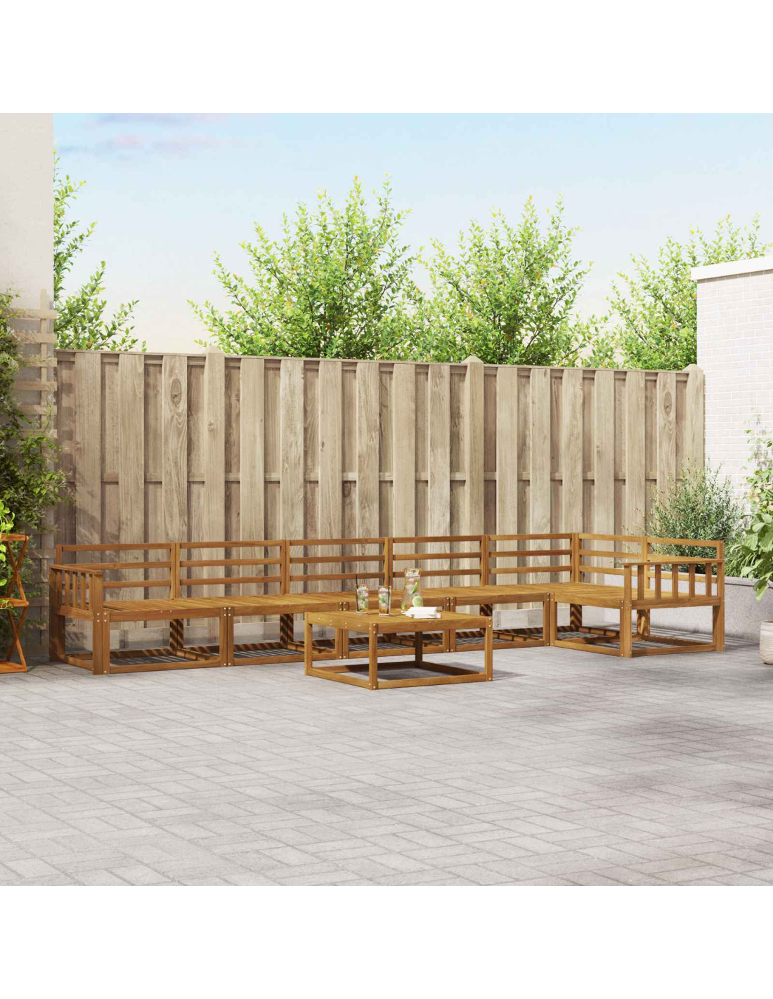 Questo elegante Outdoor Sectional Sofa Set unisce stile e funzionalità, perfetto per valorizzare qualsiasi giardino o patio. Con un design semplice, il legno di acacia gli conferisce un aspetto caldo e accogliente, ideale per riunioni familiari o serate tranquille all'aperto. Le linee pulite e il design minimale creano un'atmosfera contemporanea, ideale per ogni spazio esterno. Approfitta dell'equilibrio tra materiali resistenti e design bello, perfetto per accogliere amici o per goderti una serata tranquilla nel tuo giardino.