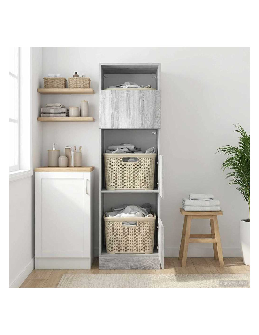 Questo armadietto per lavanderia è il mix perfetto di stile e funzionalità. Disegnato per arricchire qualsiasi bagno, ha un aspetto elegante con una superficie liscia e un design moderno. Realizzato in legno ingegnerizzato, è sia bello che resistente, rendendolo una scelta top per chi cerca ordine e stile. Ha spazio a sufficienza per tenere tutto in ordine. Finitura elegante : La finitura in legno ingegnerizzato di questo armadietto offre un look moderno e resistenza. È anche resistente all'acqua, quindi puoi usarlo anche in ambienti umidi senza problemi. Ripiani pratici : Gli utili ripiani in legno offrono un ottimo spazio per tenere in ordine tutto, dai tuoi prodotti per il bucato agli articoli per la pulizia, così hai tutto a portata di mano e organizzato. Porte robuste : Con porte a cerniera in legno ingegnerizzato, puoi aprirle e chiuderle facilmente, garantendo accesso senza fatica a ciò che hai riposto. Le porte durevoli aumentano la vita dell'armadietto e mantengono tutto in ordine. Interno spazioso : Con molto spazio, questo armadietto è perfetto per riporre vestiti, asciugamani e prodotti per la pulizia. Il suo design ottimizza la capacità senza occupare troppo spazio, rendendolo ideale per bagni di tutte le dimensioni. Facilità di cura : Tenere questo armadietto in ordine è un gioco da ragazzi. Basta passarlo con un panno umido per togliere polvere e macchie, così resta sempre fresco. Con questa manutenzione semplice, è una scelta pratica per chi ha una vita intensa.