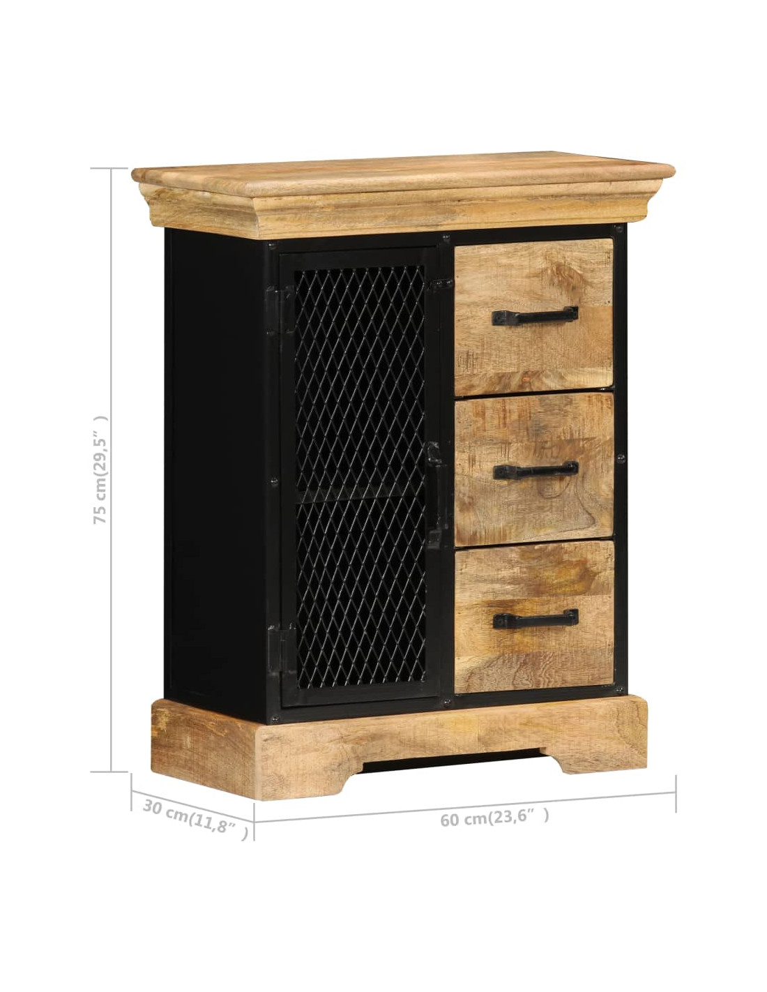 La credenza in stile retrò è realizzata in legno massello di mango, un legno duro con dense venature. Il legno di mango grezzo non solo ha la forza di sopportare pesi elevati, ma è in grado anche di resistere al meglio all'usura del tempo. Questo mobile è caratterizzato da un design accattivante ed è robusto, resistente e dall'aspetto affascinante. La perfetta artigianalità garantisce che tutte le fasi della lavorazione, dalla levigatura alla laccatura, siano eseguite con la massima cura. Il telaio in ferro verniciato a polvere aggiunge un tocco di stile industriale. Il mobile è dotato di 3 cassetti e 2 vani con una porta ed offre ampio spazio dove riporre dispositivi multimediali, vestiti, libri e altri oggetti.
