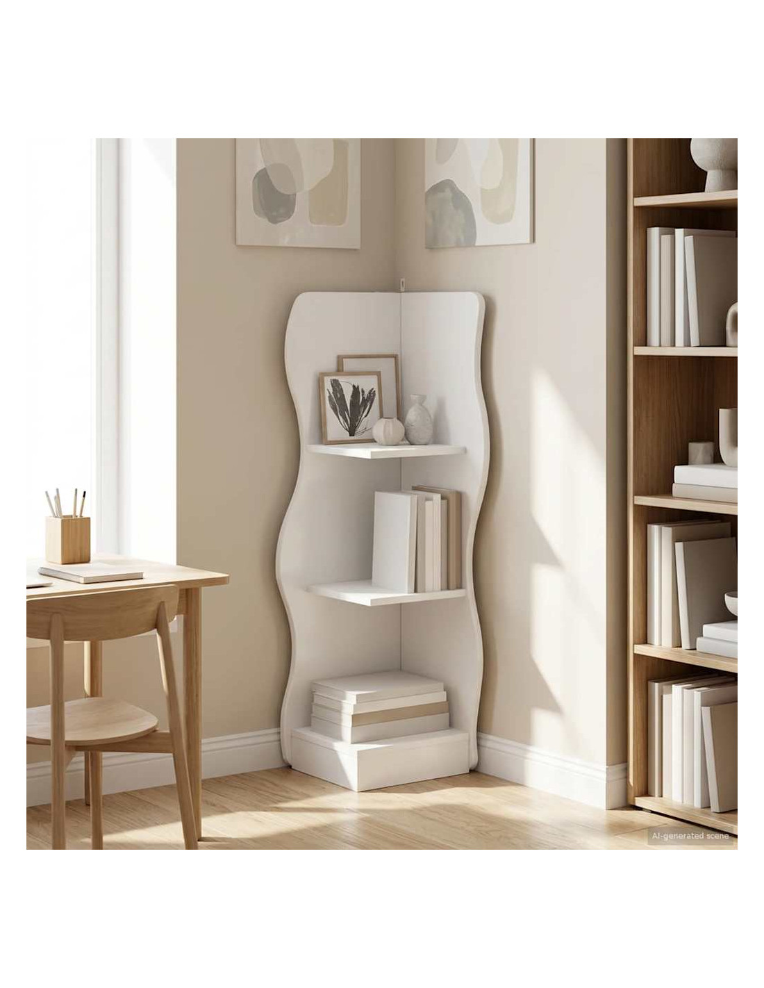 Questo scaffale angolare ha un look moderno che si inserisce in qualsiasi soggiorno. La forma a onda non è solo bella, ma sfrutta anche lo spazio, rendendolo perfetto per stanze piccole. È l'ideale per chi vuole massimizzare l'uso, aggiungendo un tocco visivo che combina funzionalità e stile. Materiale dello scaffale: È fatto di legno ingegnerizzato, una combinazione ottima di resistenza e impermeabilità, che assicura che lo scaffale resti forte anche con un po'di umidità, per una lunga durata nel tempo. Design a onda unico: Questo scaffale angolare ha un design che colpisce e ottimizza gli spazi angolari delle stanze. Ti aiuta a usare aree che prima non sfruttavi, migliorando l'ordine e lo stile della tua casa. Ripiani versatili: Grazie ai ripiani a pannello, questo scaffale è perfetto per diverse esigenze di stoccaggio, come mostrare decorazioni o riporre libri. È versatile e si adatta a vari stili di arredamento, promuovendo ordine e bellezza. Stile moderno: Questo scaffale ha un design moderno, con linee pulite e un aspetto minimal. Si abbina perfettamente agli interni contemporanei, migliorando l'estetica della stanza senza fatica. Assemblaggio e cura: Serve 2 persone per montarlo con un cacciavite. Segui le istruzioni per farlo bene e mantienilo pulito con un panno asciutto. Facile da mantenere, resta bello e funzionale nel tempo.