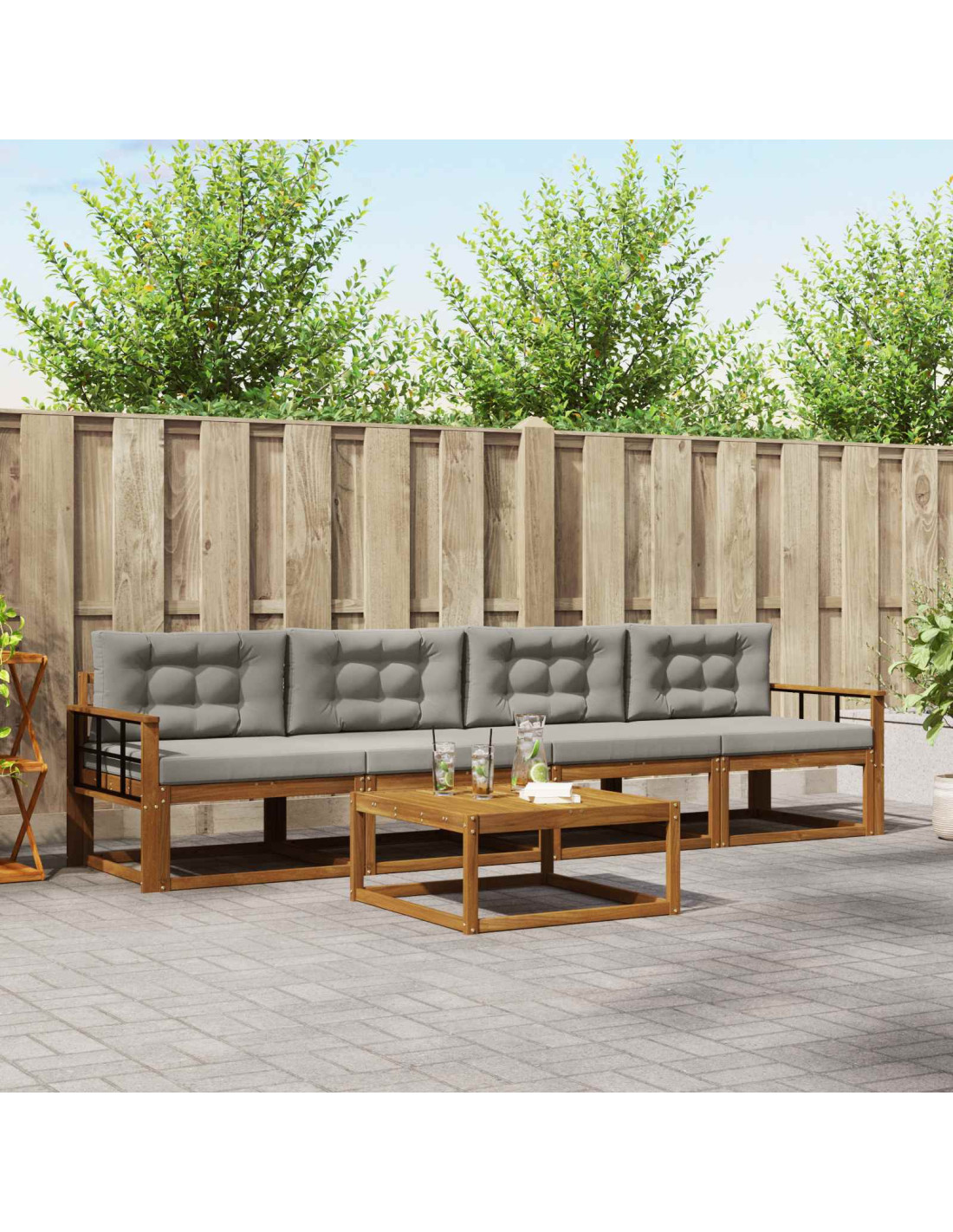 Questo set di divani modulari da esterno è il massimo per il living all'aperto moderno, unendo eleganza e funzionalità. Perfetto per un relax chic in giardini, patii o vicino alla piscina, crea un'atmosfera accogliente grazie alle sue linee pulite e minimalista. Il legno di acacia marrone naturale si integra bene in ogni contesto esterno, invitando a rilassarsi in totale comfort.